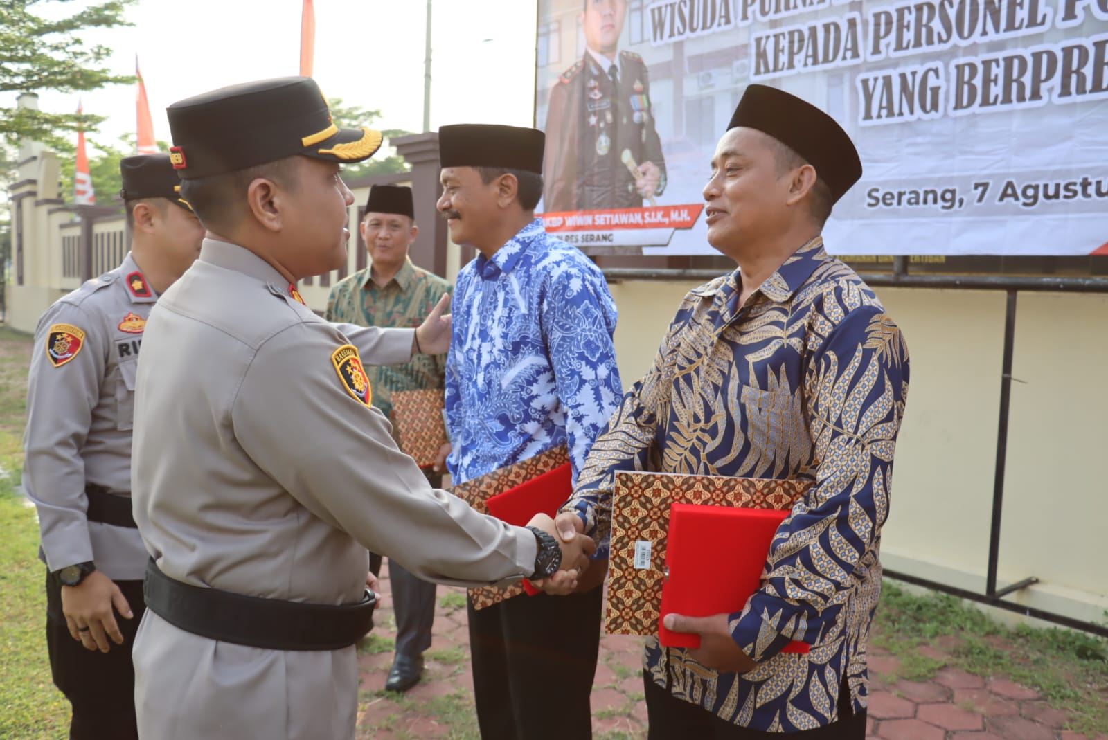 Dalam suasana khidmat di lapangan Hijau Mapolres Serang, sejumlah anggota Polri yang memasuki masa purna bakti mengenakan baju batik terlihat berdiri dengan tegap.