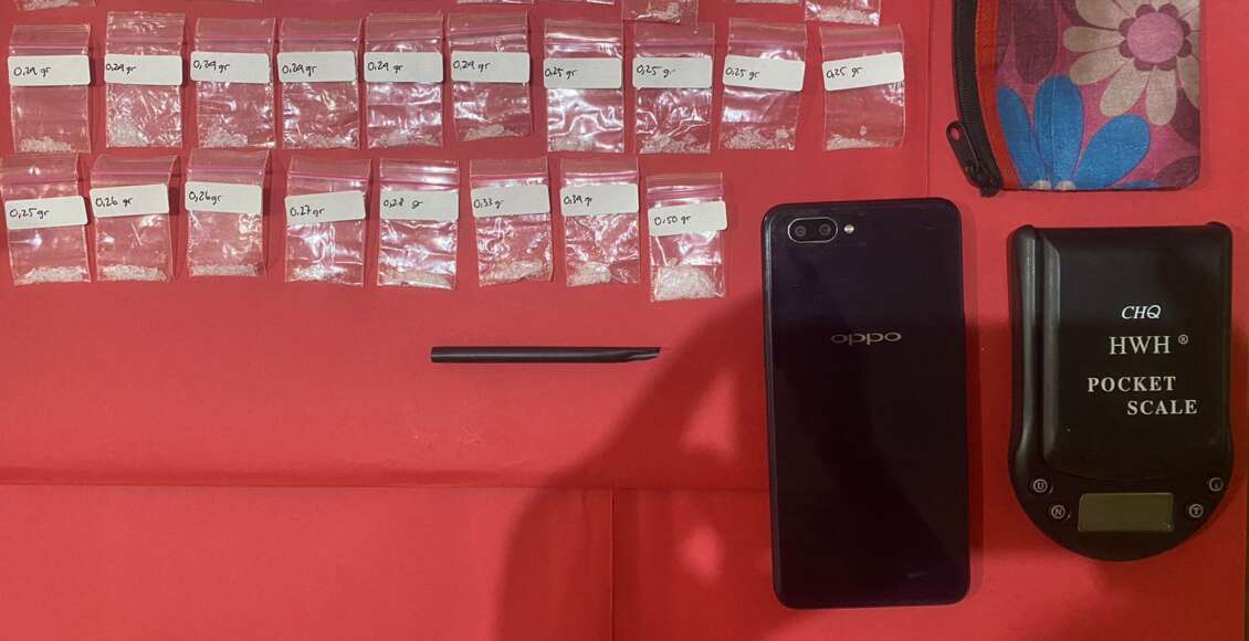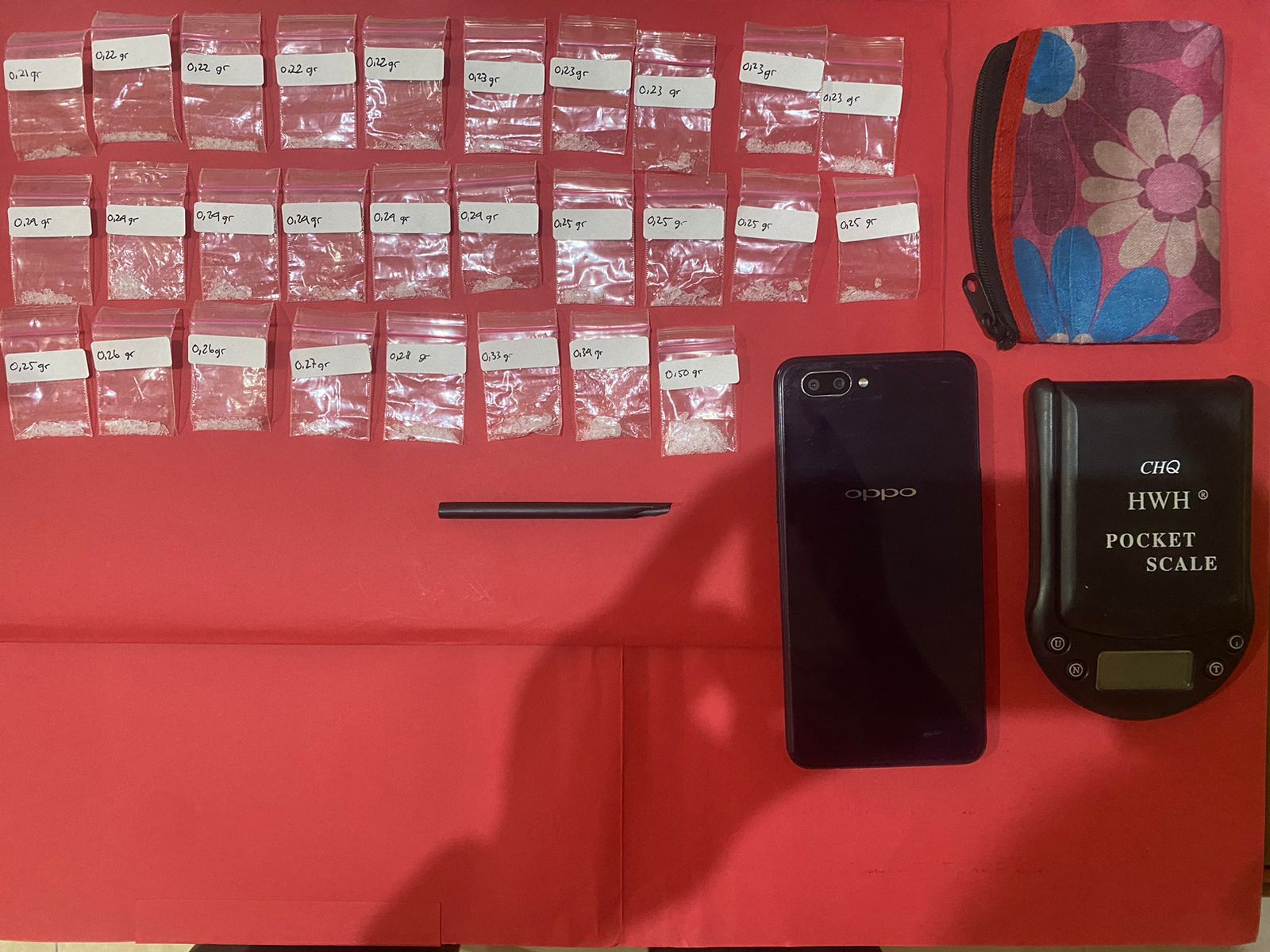 Dari hasil penangkapan pelaku, didapati sejumlah barang bukti berupa 28 (dua puluh delapan) kantong plastik yang berisi Sabu-Sabu dengan berat total 7,17 (tujuh koma satu tujuh) Gram, 1 (satu) buah sekop dari sedotan plastik, 1 (satu) buah dompet berwarna merah muda, 1 (satu) buah timbangan elektrik warna hitam,1 (satu) buah HP merk OPPO warna dongker berisi kartu XL.