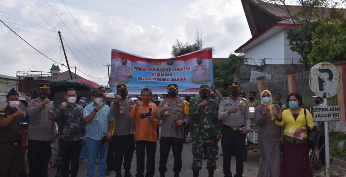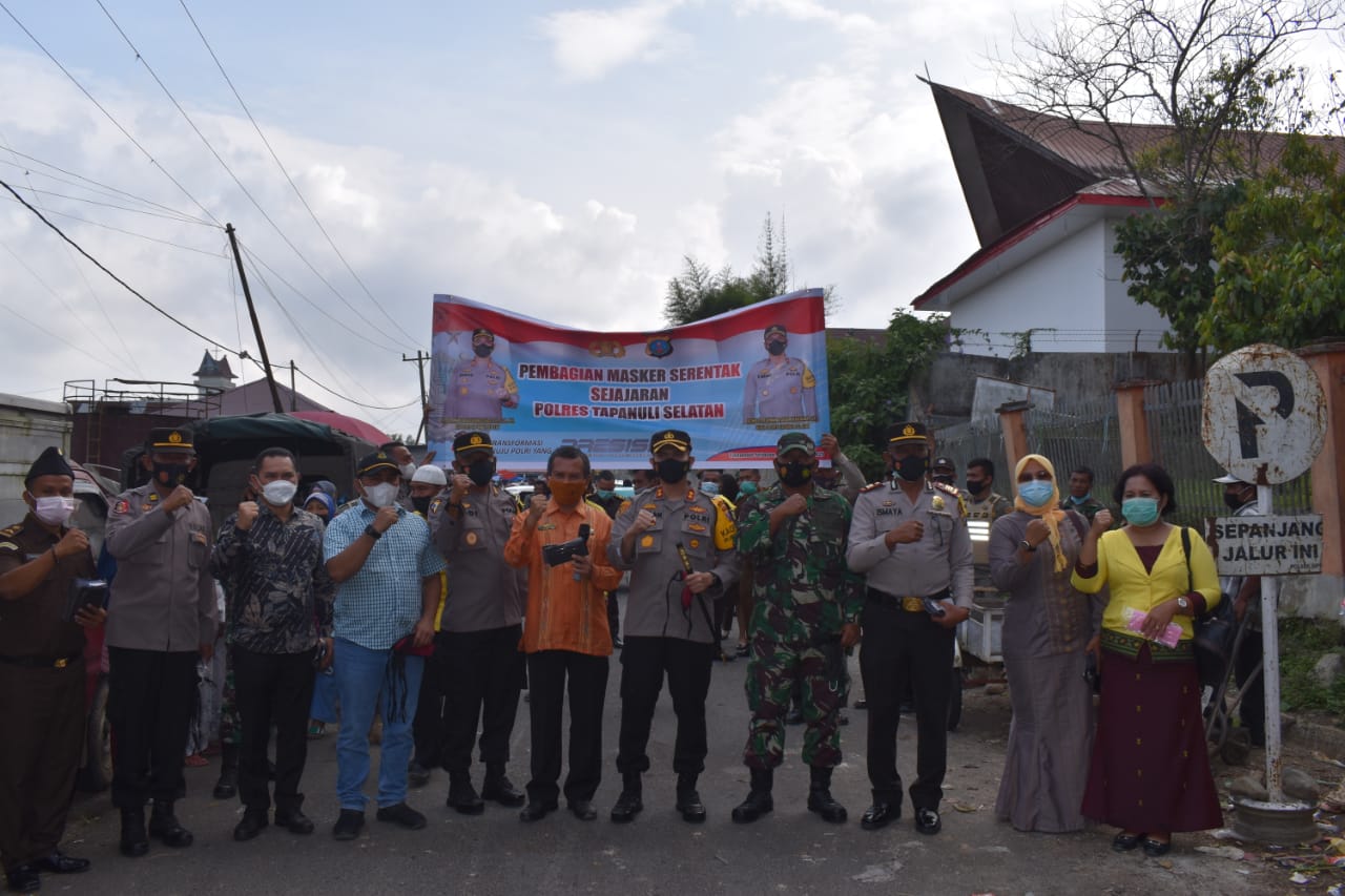 Dari pantauan wartawan di lokasi, terlihat Rombongan Kapolres Tapanuli Selatan Bersama Unsur Muspika dan Pemkab Tapsel membagikan masker kepada masyarakat sebanyak 1500 (seribu lima ratus) buah yang berada di wilayah pasar Sipirok dan sekitar Kec. Sipirok, Kab.Tapsel.