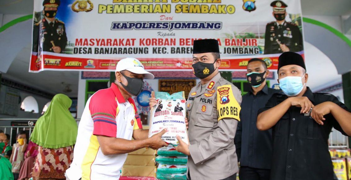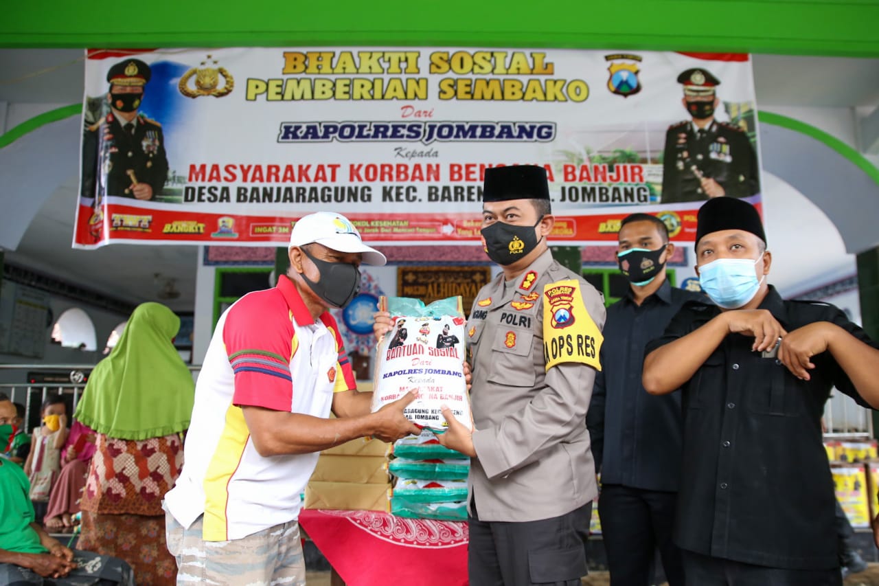 Dalam pelaksanaan kegiatan Kapolres Jombang memberikan sembako kepada masyarakat yang menjadi korban bencana banjir di Ds. Banjaragung kec. Bareng.