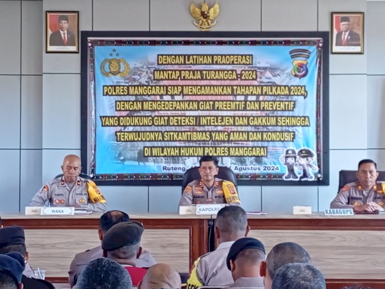 MANGGARAI,ikagawanews.id – Dalam rangka mempersiapkan pengamanan Tahapan Pilkada Serentak 2024, Polres Manggarai melaksanakan Latihan Pra Operasi Mantap Praja Turangga 2024 pada Senin, 19 Agustus 2024. Kegiatan yang berlangsung di Aula Polres Manggarai ini dimulai pukul 09.18 WITA, dengan tujuan utama meningkatkan kesiapan personel dalam menjaga situasi keamanan dan ketertiban masyarakat (Sitkamtibmas) yang aman dan kondusif.