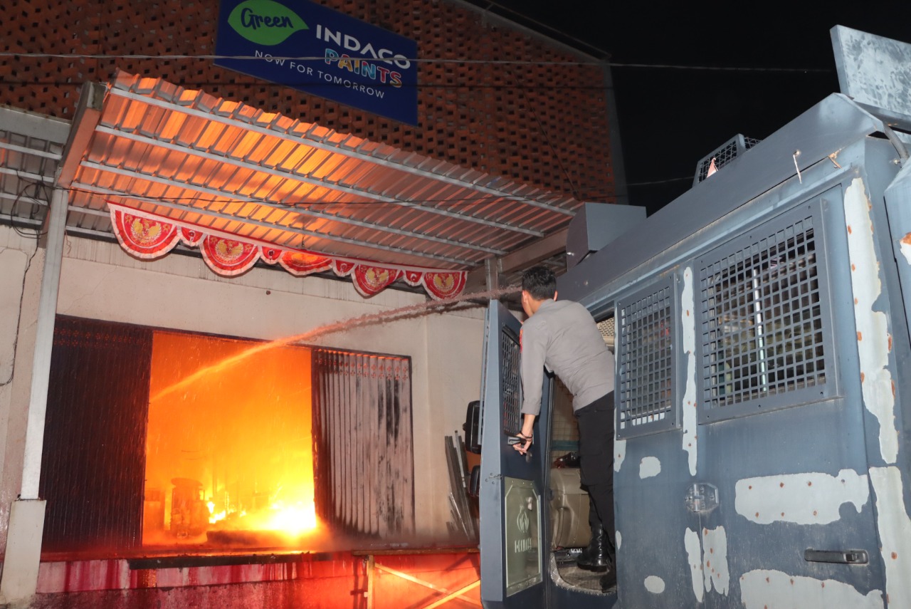 Masih dalam penyelidikan penyebab terbakarnya gudang cat indaco yang berlokasi di jalan raya Sentani Abepura, mobil AWC (Armoured Water Canon) milik Polres Jayapura bersama pemadam kebakaran Kab. Jayapura terus berupaya memadamkan api.