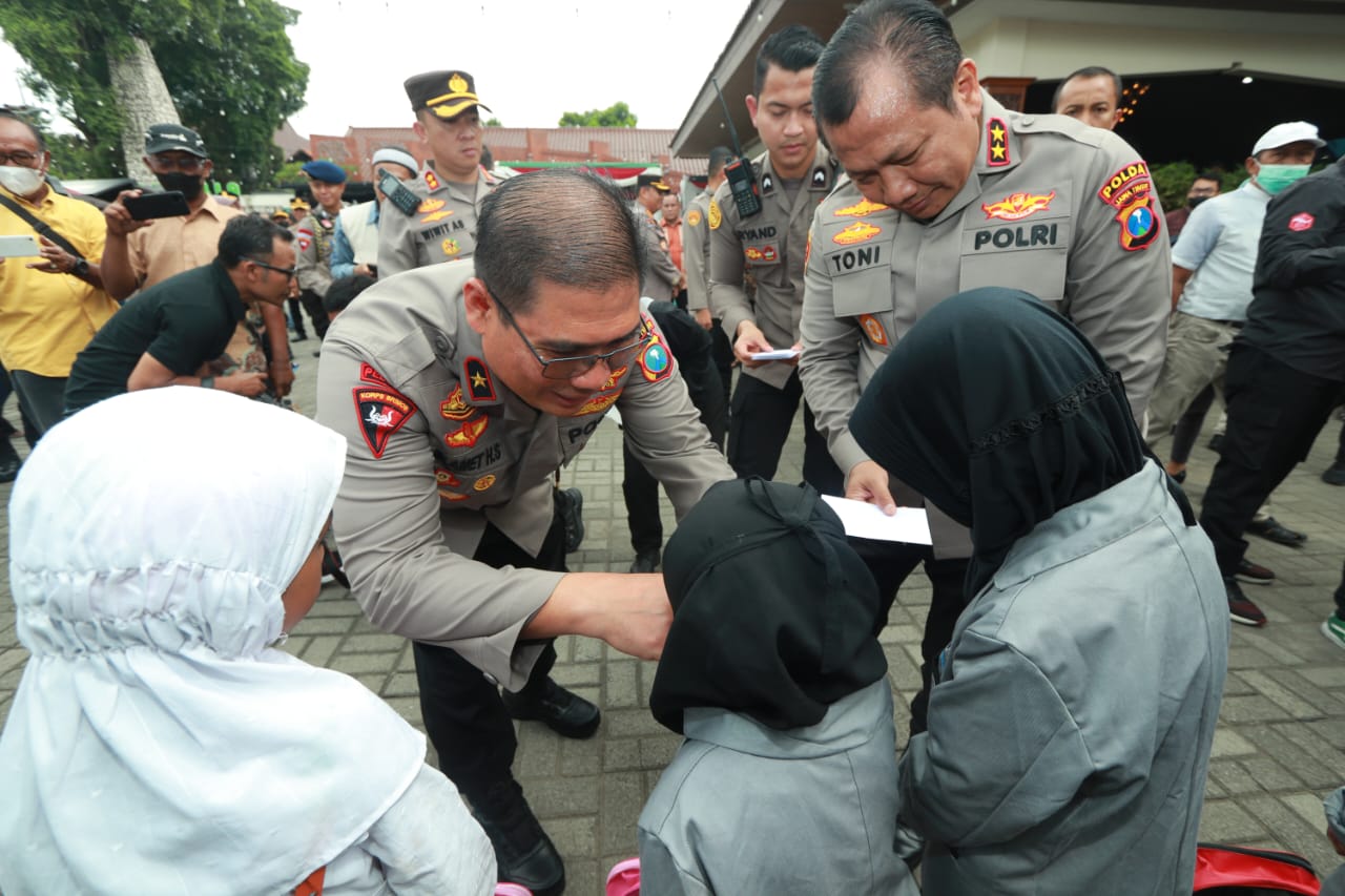 Sebelum mendengar curhatan dari warga Bumi Majapahit, Kapolda Jatim, Waka Polda dan Wali Kota serta Bupati Mojokerto, memberikan santunan kepada anak yatim piatu dan meninjau gerai kesehatan gratis yang disediakan oleh Biddokkes Polda Jatim.