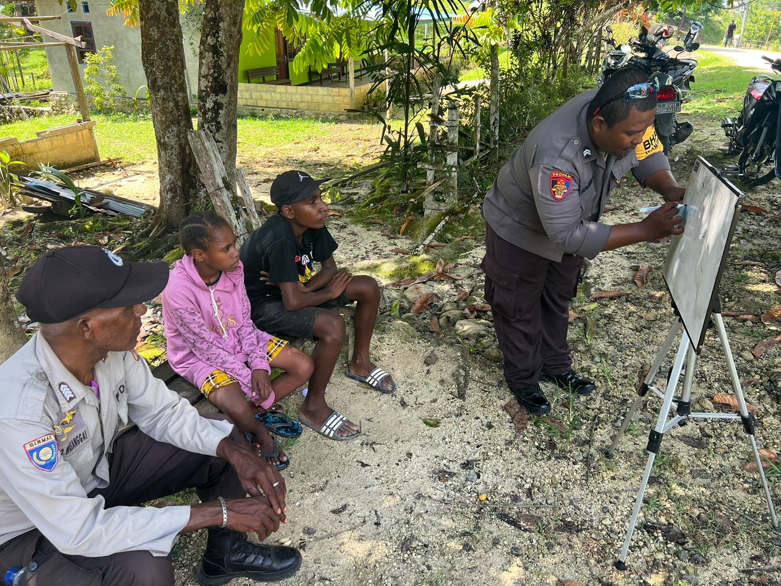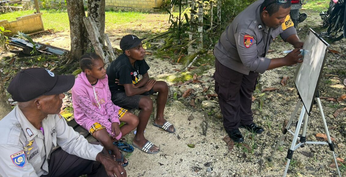 Memiliki tujuan utama memberantas buta aksara, inovasi gerakan baca tulis terus digencarkan dengan menyambangi peserta didiknya Bhabinkamtibmas Polsek Nimboran Briptu Hardin Makasehe dengan sabar mengenalkan satu persatu huruf abjad.