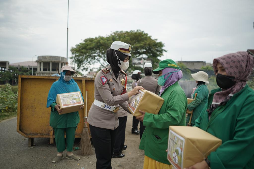 Selain itu, polwan Polantas juga memberikan bingkisan berupa masker, hand sanitizer dan bunga untuk pemohon sim dan wajib pajak wanita serta memberikan bantuan sembako kepada ibu-ibu petugas kebersihan yang sedang menyapu di area Waduk Pusong Kota Lhokseumawe.