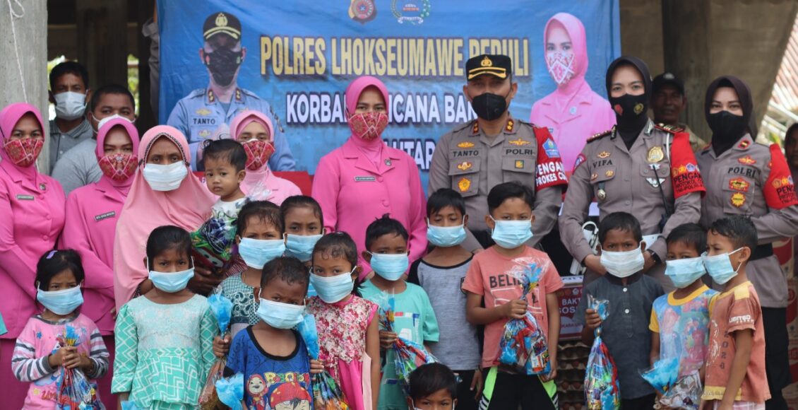 LHOKSEUMAWE,ikagawanews.id – Hibur anak – anak korban banjir di Aceh Utara, Kapolres Lhokseumawe AKBP Eko Hartanto SIK MH bersama Ketua Bhayangkari Ny. Lily Eko Hartanto dan rombongan membagikan bingkisan cantik penuh snack, Jumat (7/1/2022)