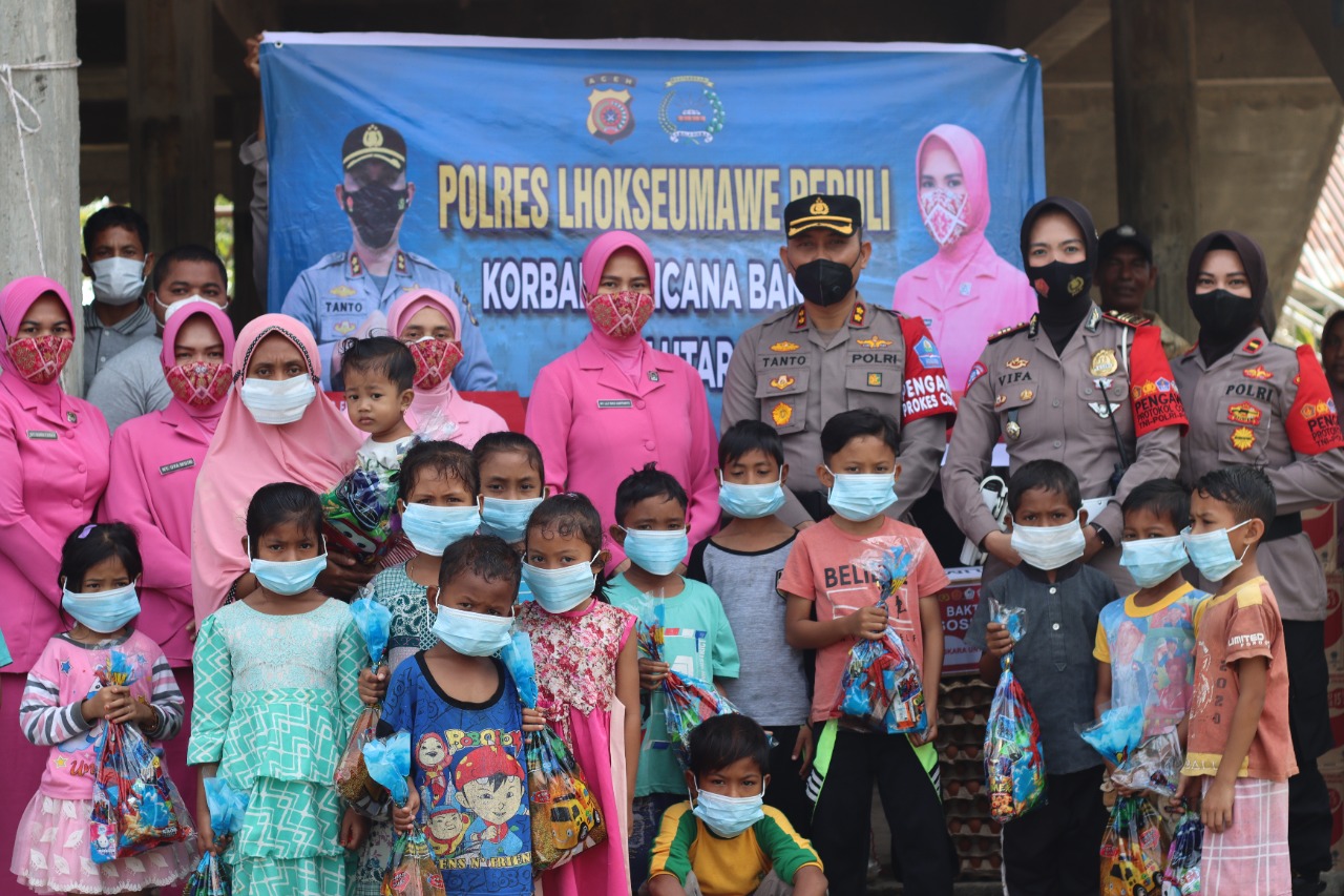 Kapolres Lhokseumawe yang didampingi sang istri tersebut turun ke lokasi pengungsian untuk melihat secara langsung kondisi korban banjir serta menyerahkan bantuan.