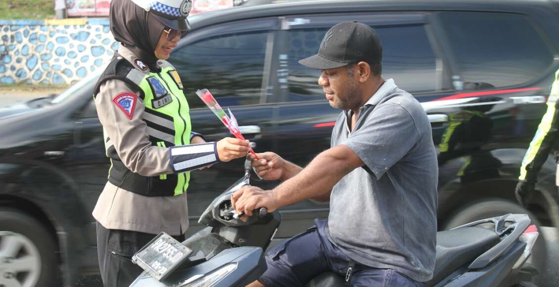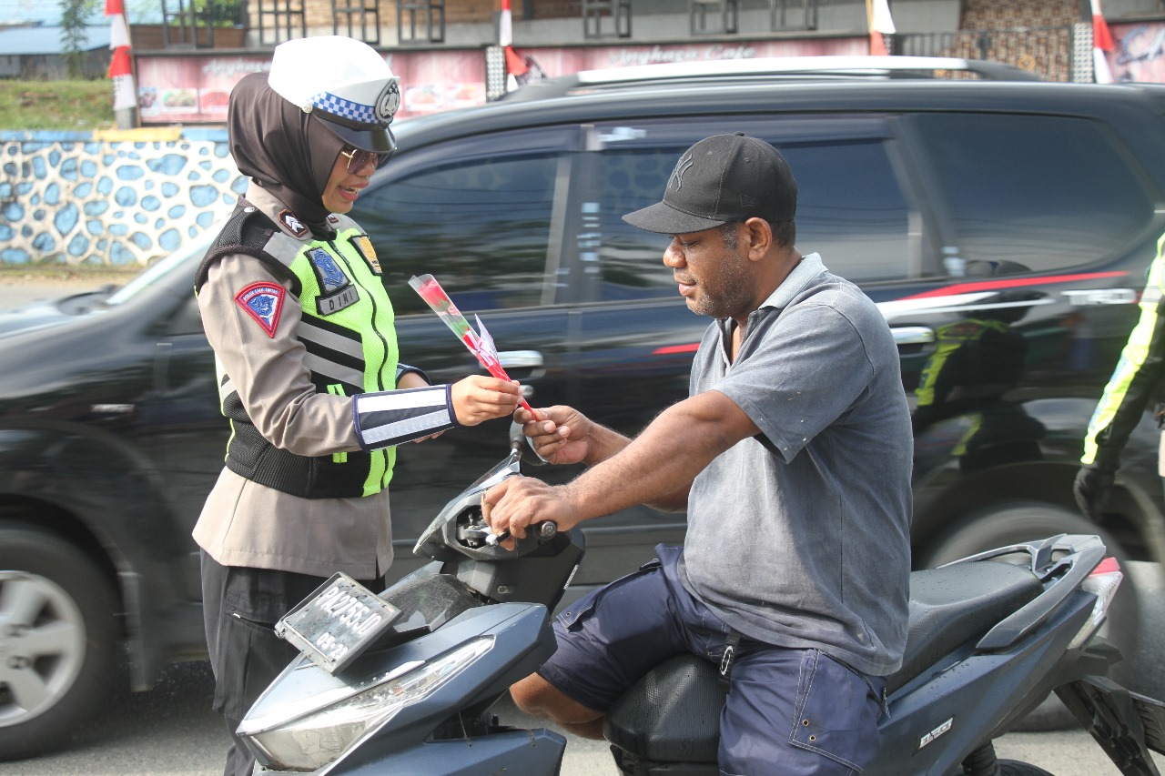 HUT ke 75, Polwan Polres Jayapura Bagikan Bunga ke Pengendara Yang Melanggar
