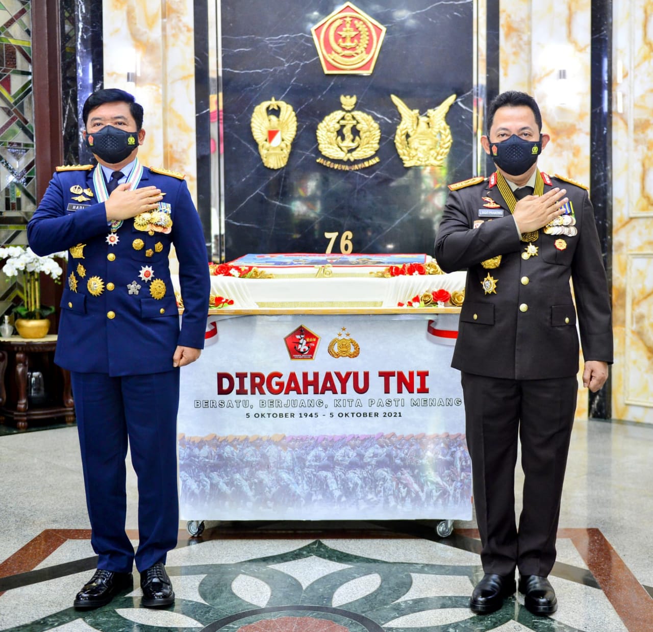 Pada momentum HUT TNI, Kapolri beserta jajaran Mabes Polri juga menyempatkan diri untuk memberikan kejutan dengan membawa kue ulang tahun kepada Panglima TNI Marsekal Hadi Tjahjanto di kantornya Subden Merdeka Barat Denma Mabes TNI, Merdeka Barat, Jakarta Pusat.