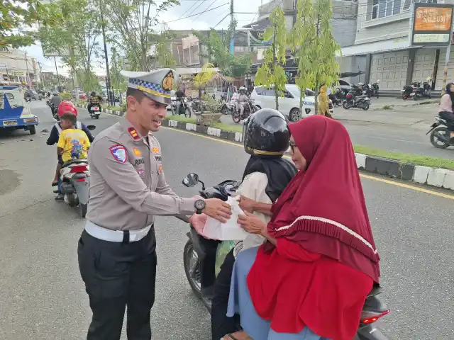 Tampak personel Satlantas membagikan ratusan takjil atau menu berbuka Puasa kepada pengendara sepeda motor, mobil, serta masyarakat yang melintas. Selain membagikan takjil, petugas juga melaksanakan patroli untuk menjaga keamanan, keselamatan, ketertiban, dan kelancaran lalu lintas (Kamseltibcarlantas) selama bulan Ramadan di sekitaran Kota Meulaboh.