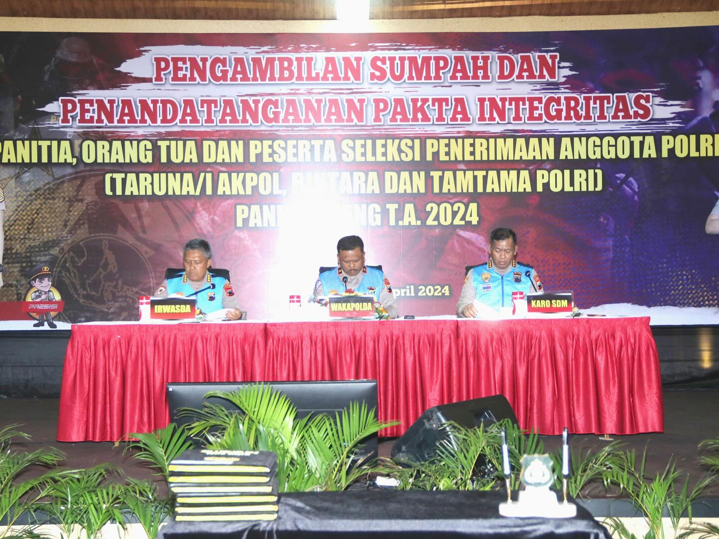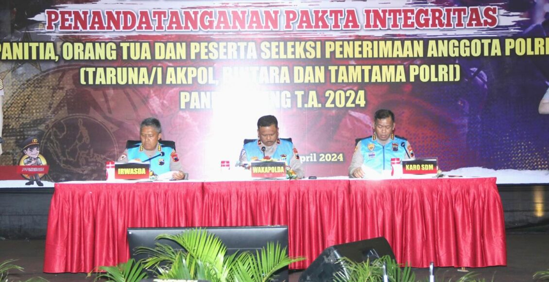 Dalam sambutannya, Wakapolda mengungkapkan bahwa penandatanganan pakta integritas dan pengambilan sumpah ini merupakan bentuk komitmen bersama dalam mewujudkan penerimaan Polri yang BETAH (Bersih Transparan, Akuntabel dan Humanis) di lingkup Polda Jateng.