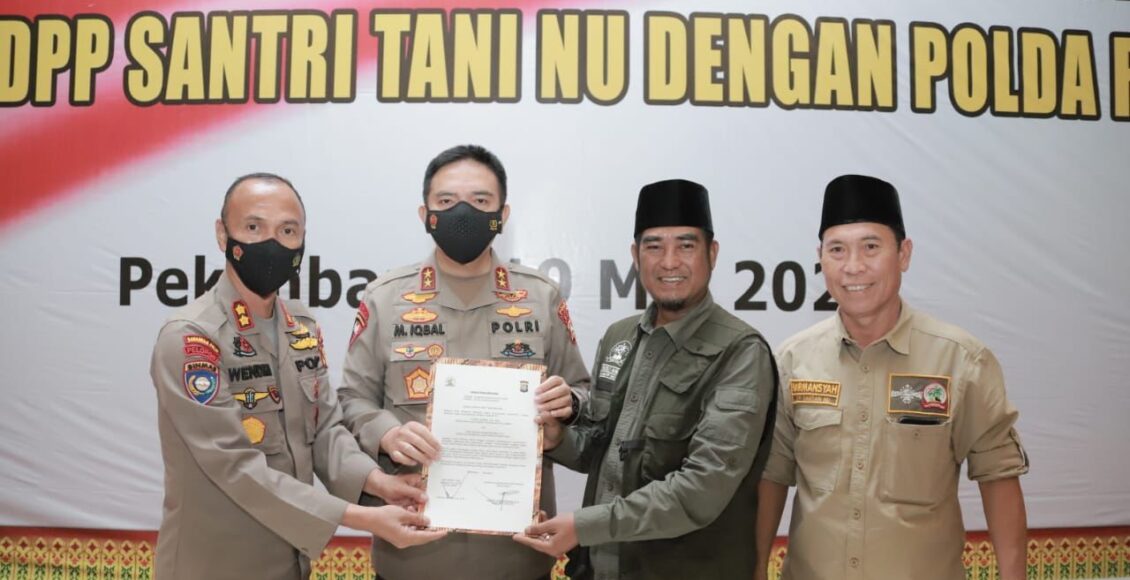 PEKANBARU,ikagawanews.id – Disaksikan Kapolda Riau Irjen Moh Iqbal, nota kesepahaman dan kerjasama Polda Riau dengan Santri Tani ditandatangani oleh Direktur Binmas AKBP Wendry Purbyantoro SH dan Ketua Umum DPP Santri Tani NU T Rusli Ahmad SE MM. Acara penandatanganan tersebut dilaksanakan bertepatan digelarnya acara apel akbar Bhabinkamtibmas se jajaran Polda Riau di Ballroom hotel Labersa pada Kamis (19/5/2022).