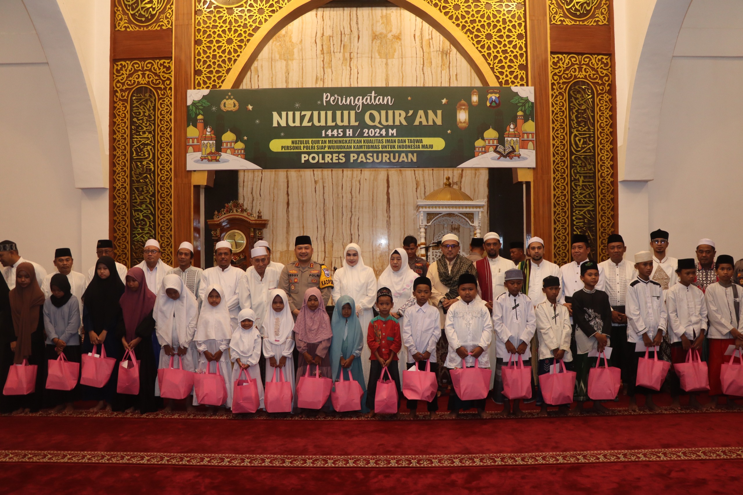 Dalam acara Nuzulul Qur’an tersebut Kapolres Pasuruan dengan didampingi oleh Ketua Bhayangkari Cabang Pasuruan juga memberikan santunan kepada 25 anak-anak yatim dari yayasan Candi Binangun Kecamatan Sukorejo.