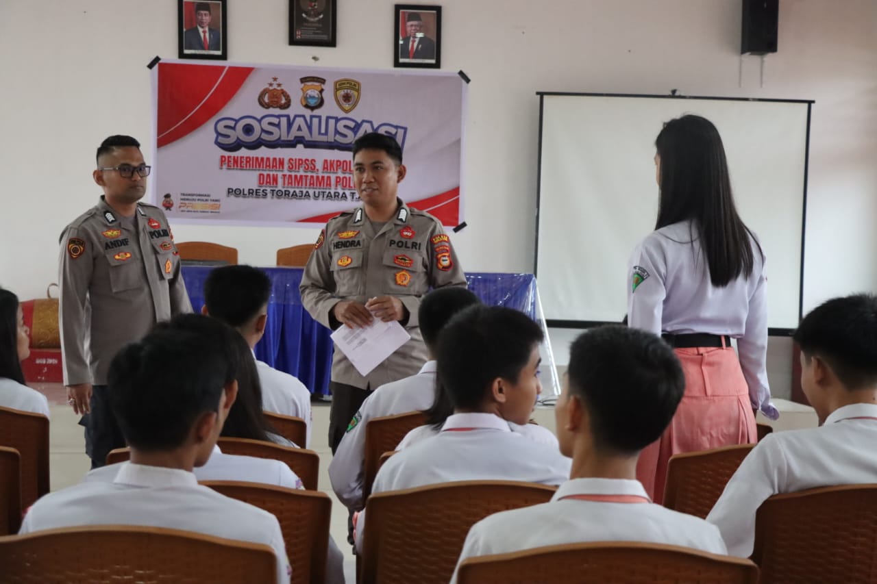 Bripka Hendra Toyang menerangkan dilakukannya sosialisasi penerimaan Calon Anggota Polri ke sekolah yang ada ini bertujuan untuk meningkatkan animo pendaftaran calon anggota Polri dari Kabupaten Toraja Utara meningkat dibanding tahun 2023 lalu.