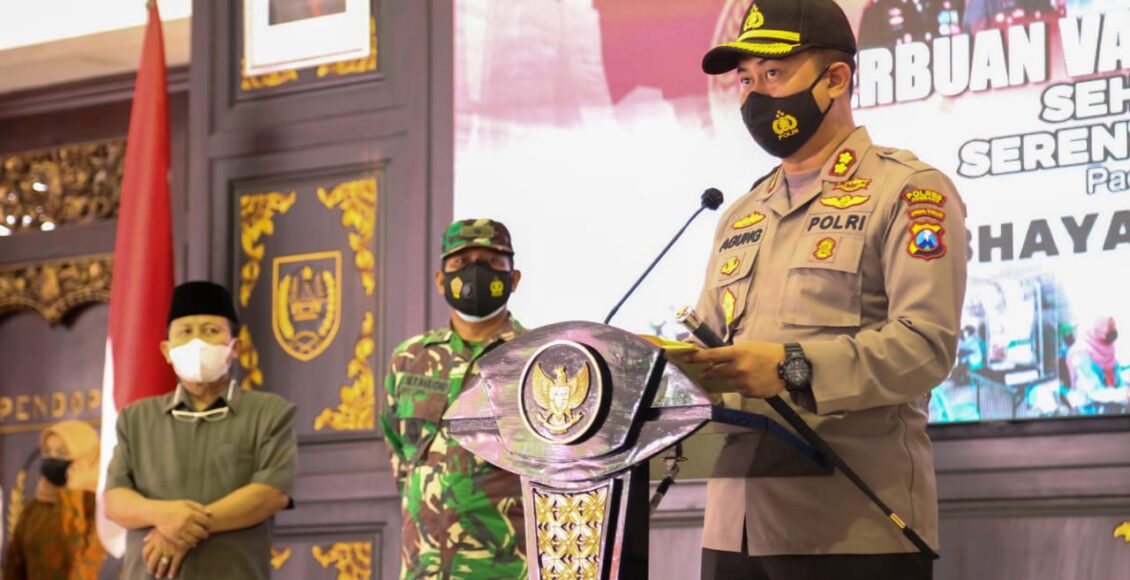 Dalam sambutannya, Kapolres Jombang, AKBP Agung Setyo Nugroho mengucapkan terima kasih kepada Pemerintah Kabupaten Jombang yang telah memfasilitasi kegiatan vaksinasi dalam rangka memperingati hari Bhayangkara ke 75. Polres Jombang melakukan kegiatan vaksinasi masal sejumlah 3200 vaksin untuk masyarakat Kabupaten Jombang. Vaksinasi massal ini sudah dilakukan sejak kemarin di Sat Lantas Polres Jombang, Polsek Perak dan Polsek Bareng dengan 2.800 dosis, dan hari ini target kita 3200 dimulai beberapa hari yang lalu.