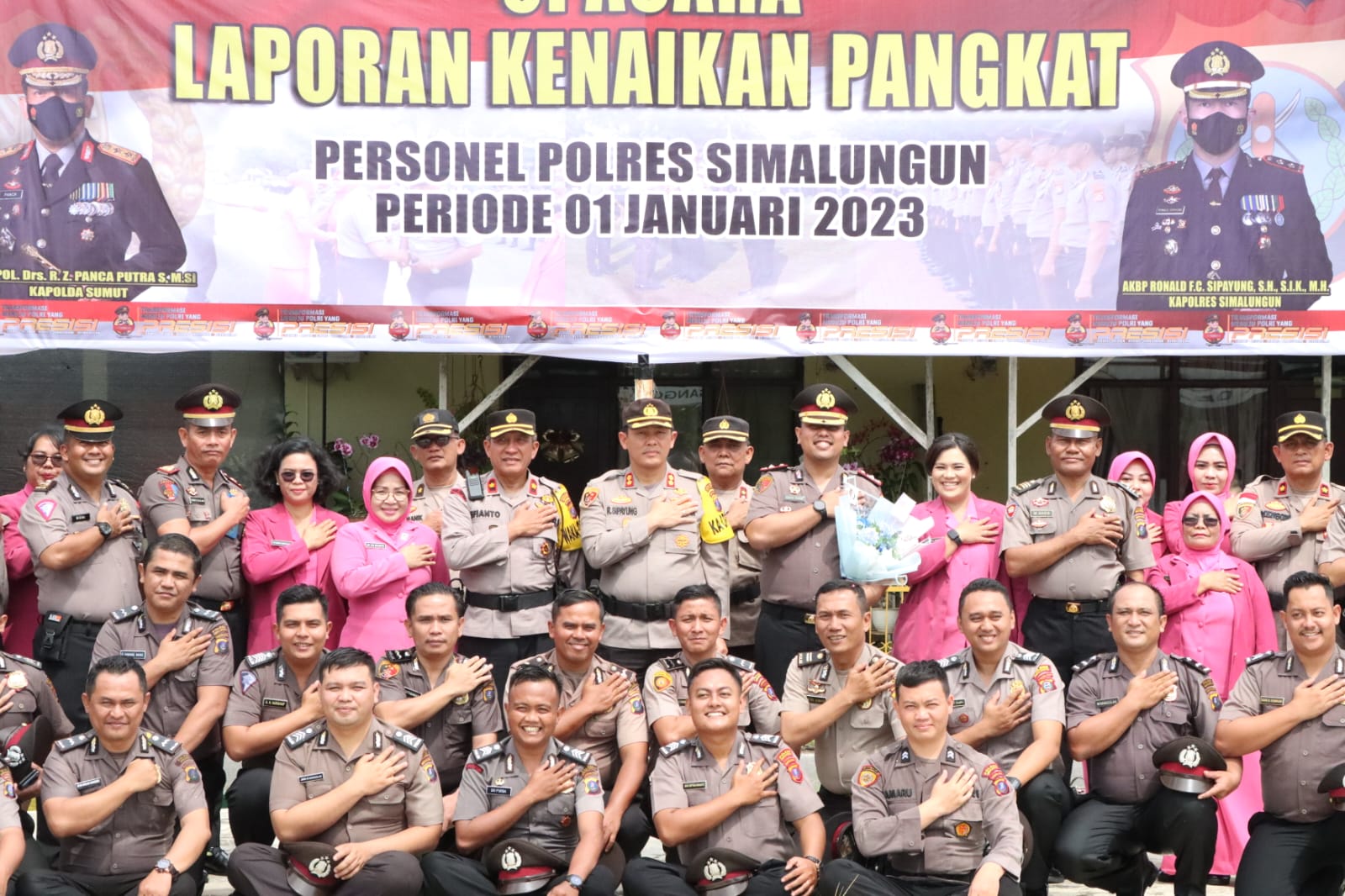 Tampak hadir dalam kegiatan mendampingi Kapolres Simalungun AKBP Ronald F.C Sipayung, S.H., S.I.K., M.H., Ketua Bhayangkari Cabang Simalungun Ny. Erika Ronald Sipayung., Wakapolres Simalungun KOMPOL Efianto, SH., Kabag Ops Polres Simalungun KOMPOL Kristo Tamba, S.H., S.I.K., M.I.K., Kabag Sumda Polres Simalungun KOMPOL Joner Purba., Kabag Ren Polres Simalungun KOMPOL Lamhot Siregar, SH., Kapolsek Sejajaran Polres Simalungun., Kasat Reskrim Polres Simalungun AKP. Rachmat Aribowo, S.I.K., M.H., Kasat Narkoba Polres Simalungun AKP Adi Haryono, SH., Kasat Binmas Polres Simalungun AKP Hengky B. Siahaan, SH., Kasat Samapta Polres Simalungun AKP P. Butar-butar, SH., Kasat Intelkam Polres Simalungun IPTU Teguh Raya Putra Sianturi., Kasi Humas Polres Simalungun AKP M. Nasib., Kasipropam Polres Simalungun IPTU B.Tobing., Personel Polri dan ASN Polres Simalungun yang menerima Kenaikan Pangkat Periode 01 Januari 2023.(joe)
