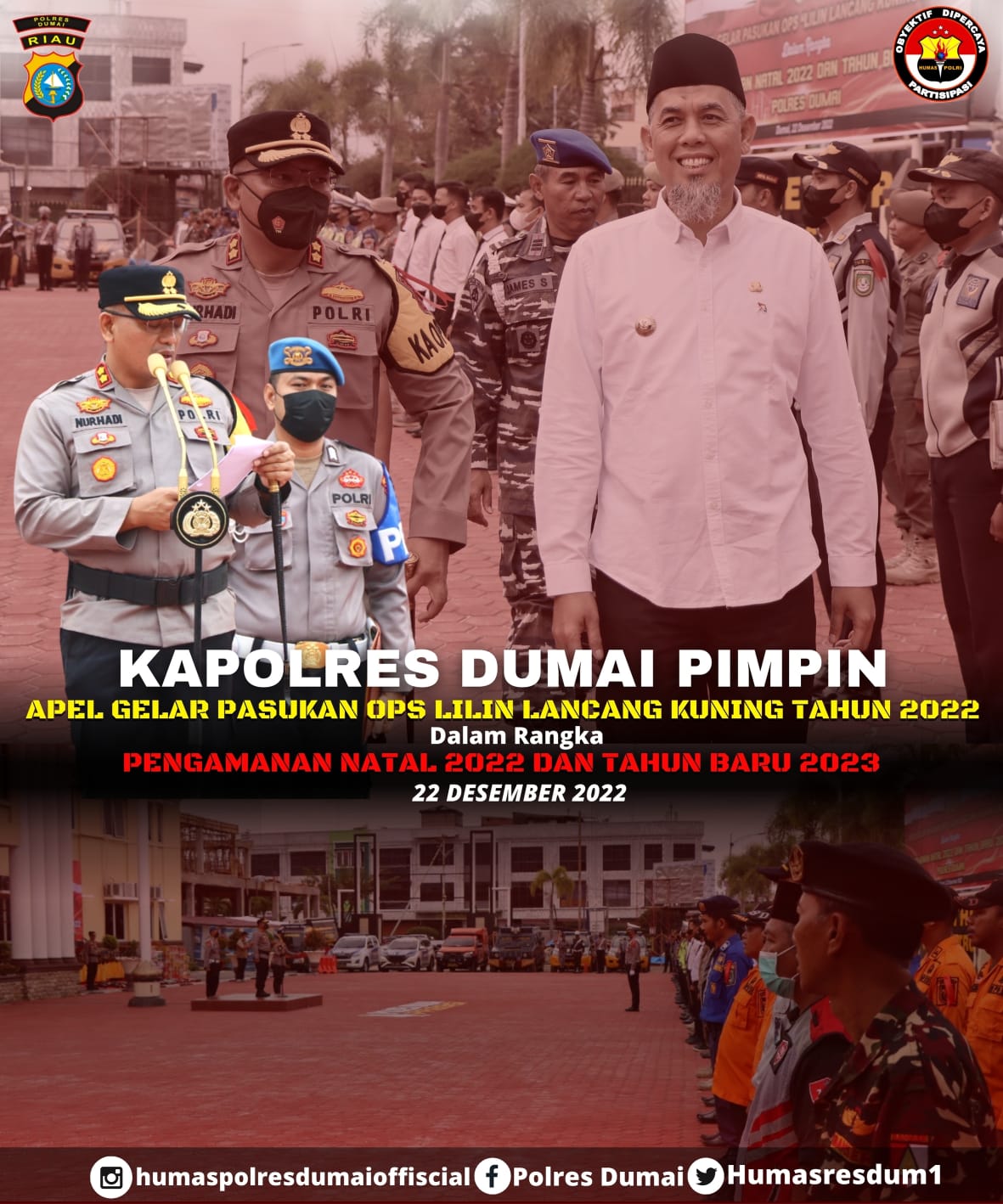 DUMAI ,ikagawanews.id  – Guna memberikan rasa aman dan nyaman selama perayaan Natal tahun 2022 dan Tahun Baru 2023, Kepolisian Resor (Polres) Dumai menggelar Operasi Lilin Lancang Kuning Tahun 2022 yang dilaksanakan selama 11 hari dimulai dari tanggal 23 Desember 2022 sampai 2 Januari 2023.
