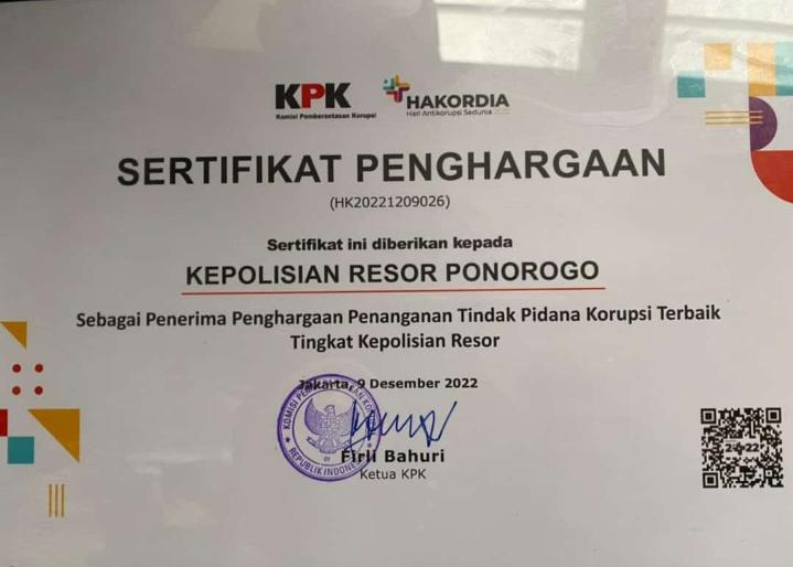 Mantan Kapolres Batu itu pun berterimakasihlah kepada semua pihak yang telah membantu. Sehingga Polres Ponorogo mendapatkan penghargaan dari KPK ini.