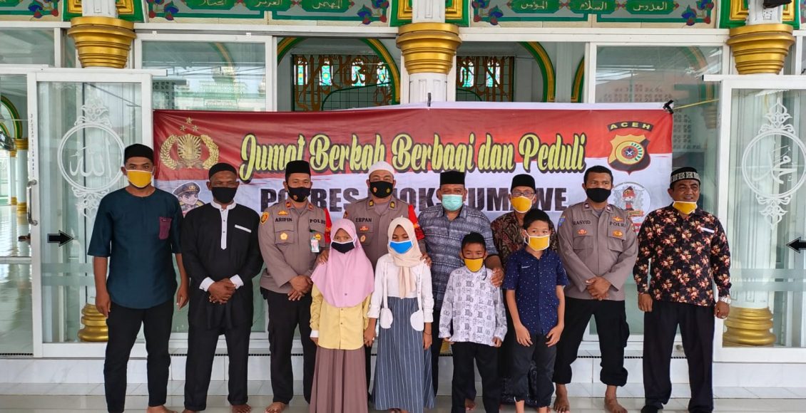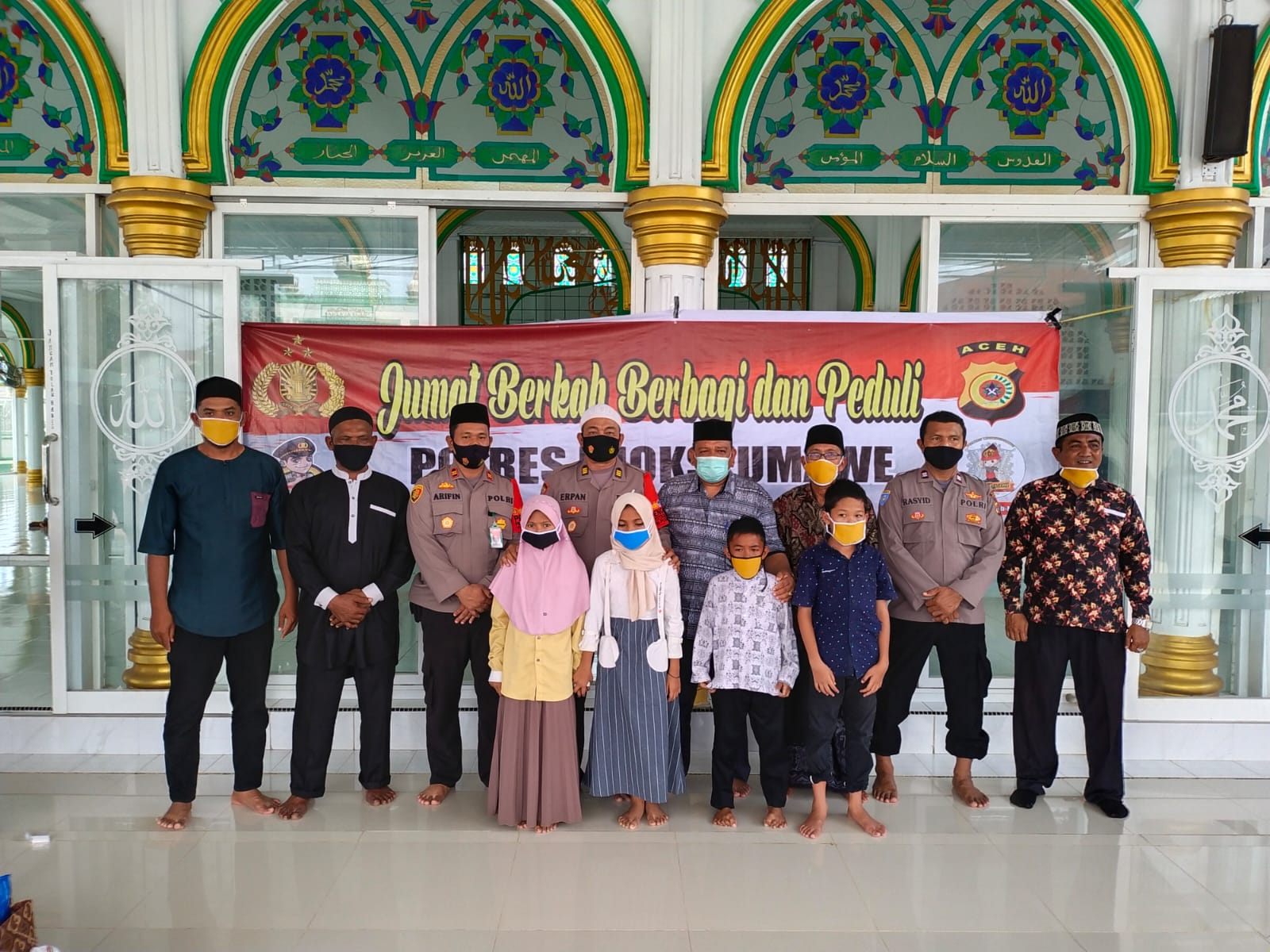Jumat Berkah Berbagi dan Peduli Polres Lhokseumawe Santuni Puluhan Yatim Piatu di Desa Pusong Lama