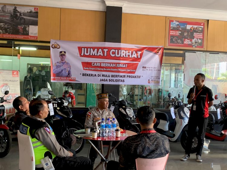 Manggarai,ikagawanews.id  – Dalam upaya mempererat silaturahmi dan komunikasi dengan masyarakat, Polres Manggarai melaksanakan kegiatan Jumat Curhat Cari Berkah Jumat (Cerita Ringan dan Sharing Bersama Kapolres Manggarai) pada hari Jumat, 12 Juli 2024 pukul 09.00 WITA. Acara ini berlangsung di Dealer Honda Nasional Motor, Jalan Wae Ces, Kelurahan Karot, Kecamatan Langke Rembong, Kabupaten Manggarai.