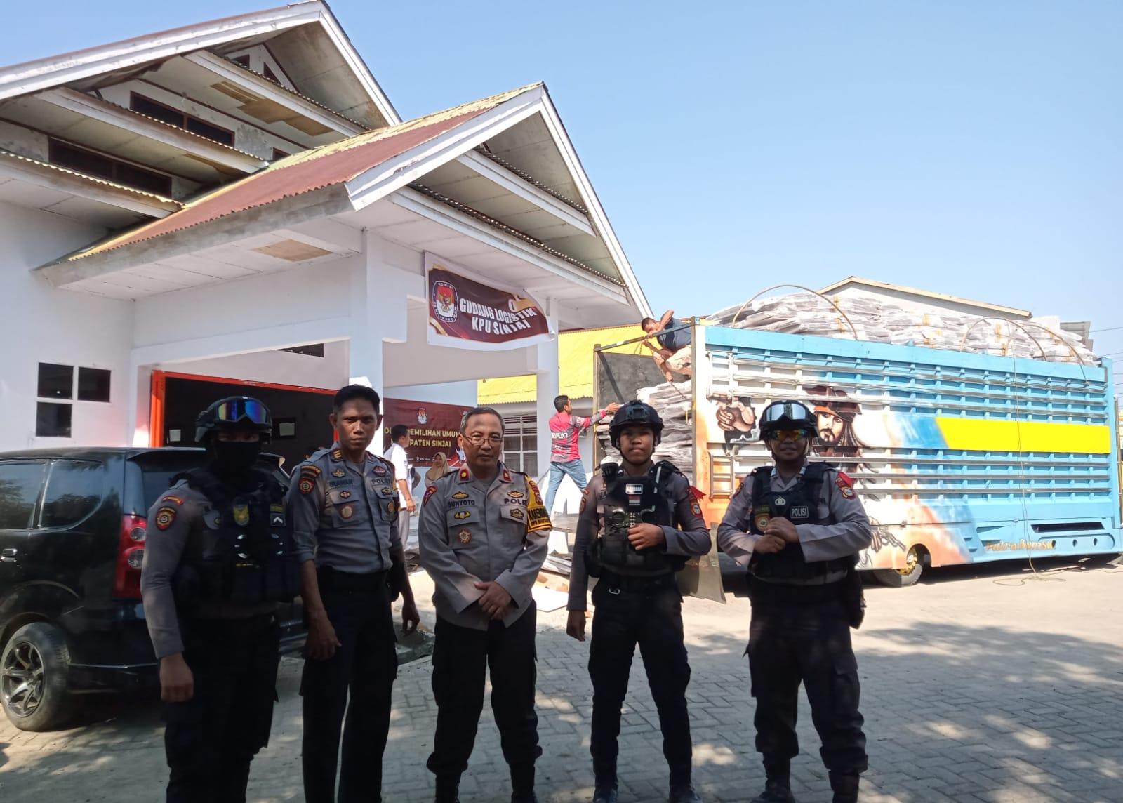 SINJAI,ikagawanews.id – Kabag Ops Polres Sinjai Kompol Sunyoto S.Sos didampingi Kasat Samapta Polres Sinjai Akp Iriawan Pribadi dan Kaur Intelkam Polres Sinjai Ipda Agus Santoso pimpin personel pengamanan kedatangan logistik Pemilu 2024 berupa kotak suara, diKPUD Sinjai, Jalan Bhayangkara, Kelurahan Bongki, Kecamatan Sinjai Utara, Kabupaten Sinjai, Kamis sore (26/10/2023).