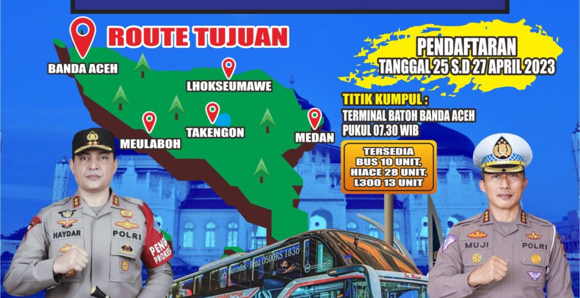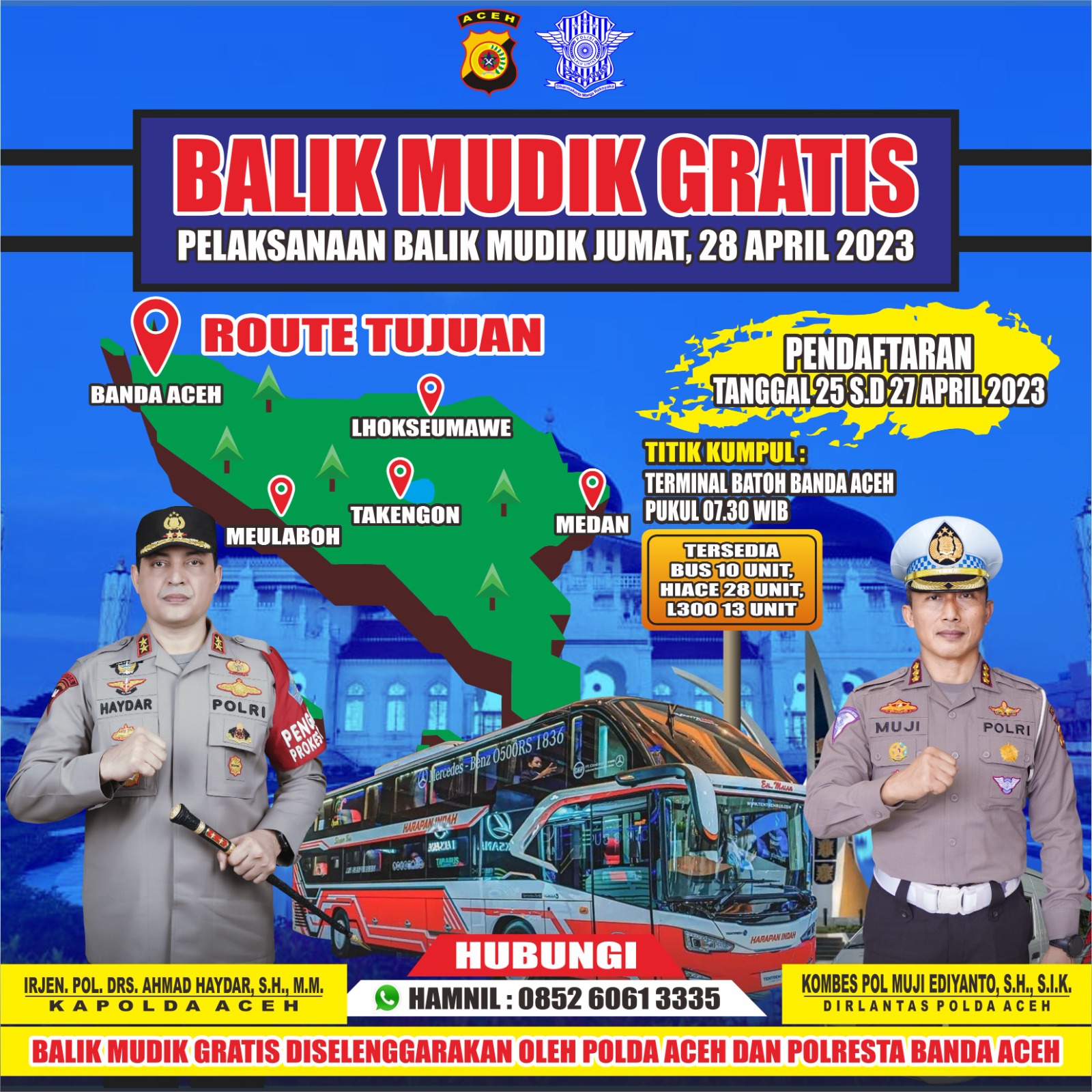 Ia menjelaskan, armada balik mudik gratis tersebut dikoordinir Dirlantas Polda Aceh Kombes Muji Ediyanto. Bagi masyarakat yang ingin menikmati fasilitas balik mudik gratis tersebut silakan mendaftar dari 25-27 April 2023 melalui nomor handphone: 085260613335.