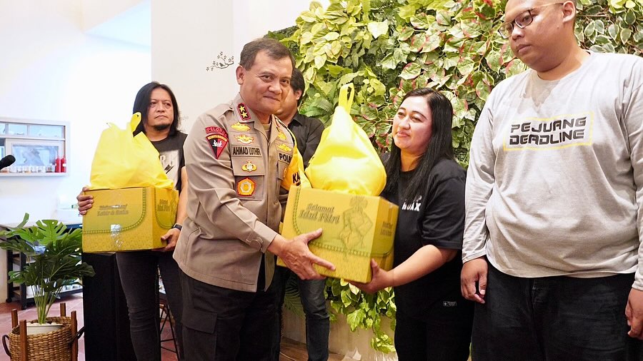 “Kamu mudik kapan? Nggak mudik? Ya sama, nanti kalau wartawan mudik semua yang bikin berita siapa?” canda Kapolda disambut senyum dan tawa awak media.