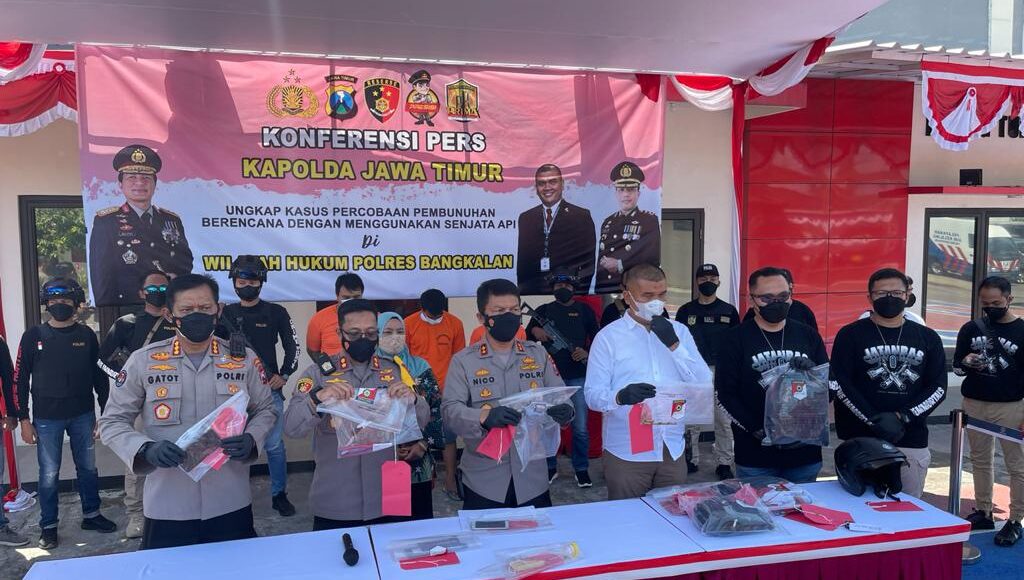 Bangkalan,IKAGAWANEWS.ID – Kapolda Jawa Timur Irjen Pol Nico Afinta, didampingi Dirreskrimum Kombes Totok Suhariyanto, dan pejabat utama Polda Jatim, Kapolres Bangkalan AKBP Alith Alarino serta Kasubdit Jatanras Polda Jatim AKBP Lintar Mahardono, Kamis (12/8/2021) siang, merilis hasil ungkap tindak pidana percobaan pembunuhan yang direncanakan dengan menggunakan senjata api illegal.