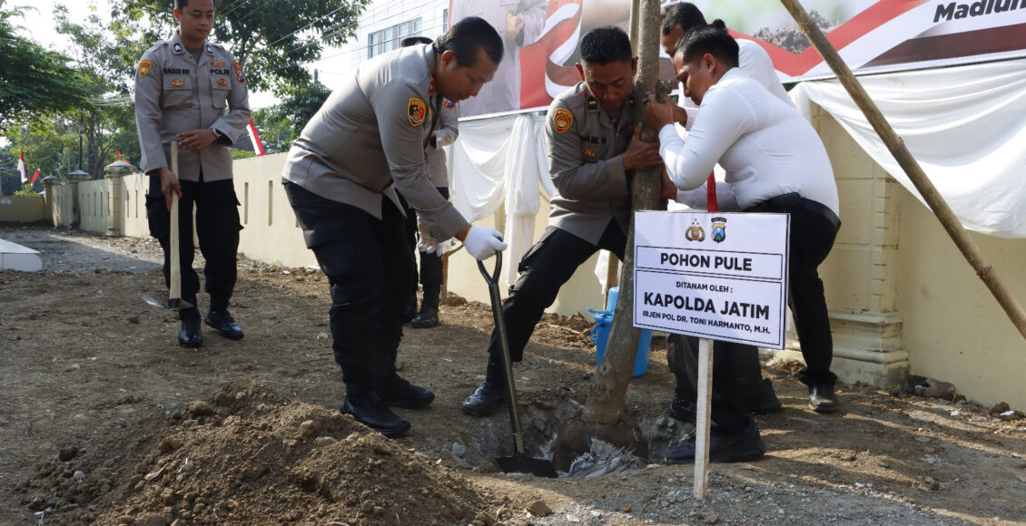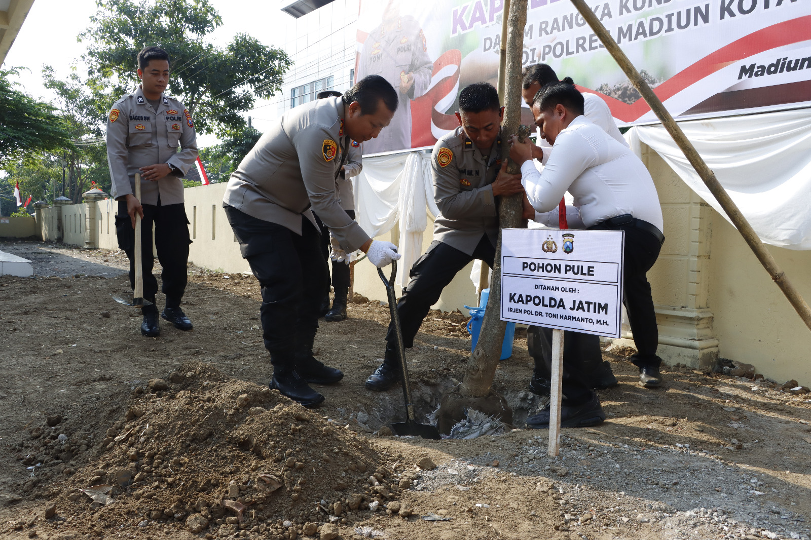 Selesai arahan di gedung Sunaryo Kapolda Jatim beserta rombongan didampingi Kapolres Madiun Kota dan PJU melakukan penanaman pohon di samping gedung TS Bhara Makota yang tidak jauh dari Mapolres Madiun Kota.