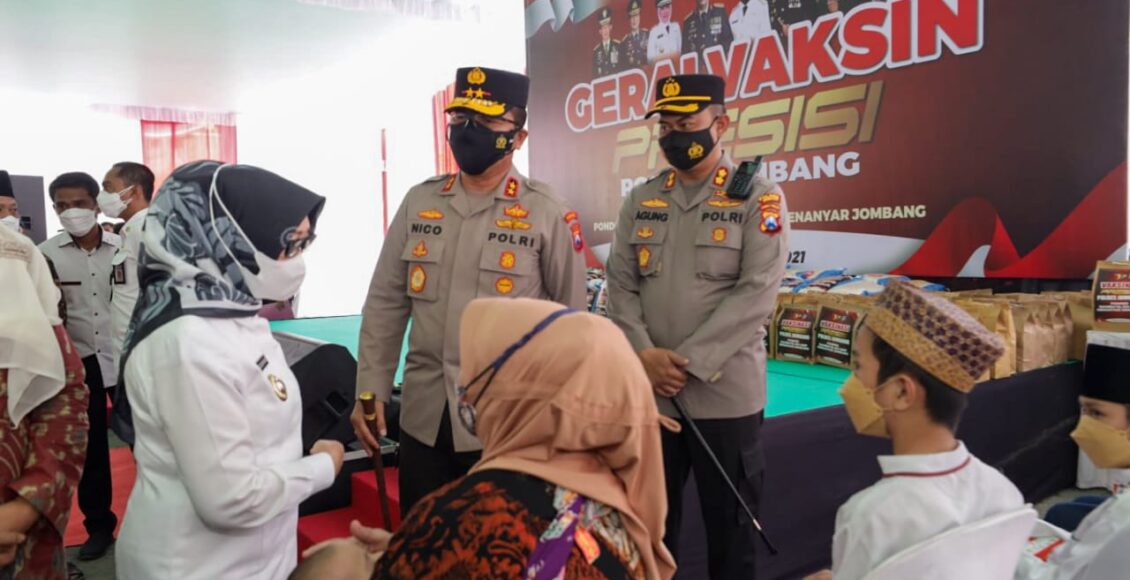 JOMBANG,ikagawanews.id – Kapolda Jatim Irjen Pol Nico Afinta meninjau pelaksanaan vaksinasi COVID-19 di Pondok Pesantren Mambaul Maarif, Denanyar, Jombang dan berpesan kepada semua masyarakat agar selalu mematuhi protokol kesehatan meskipun sudah disuntik vaksin.