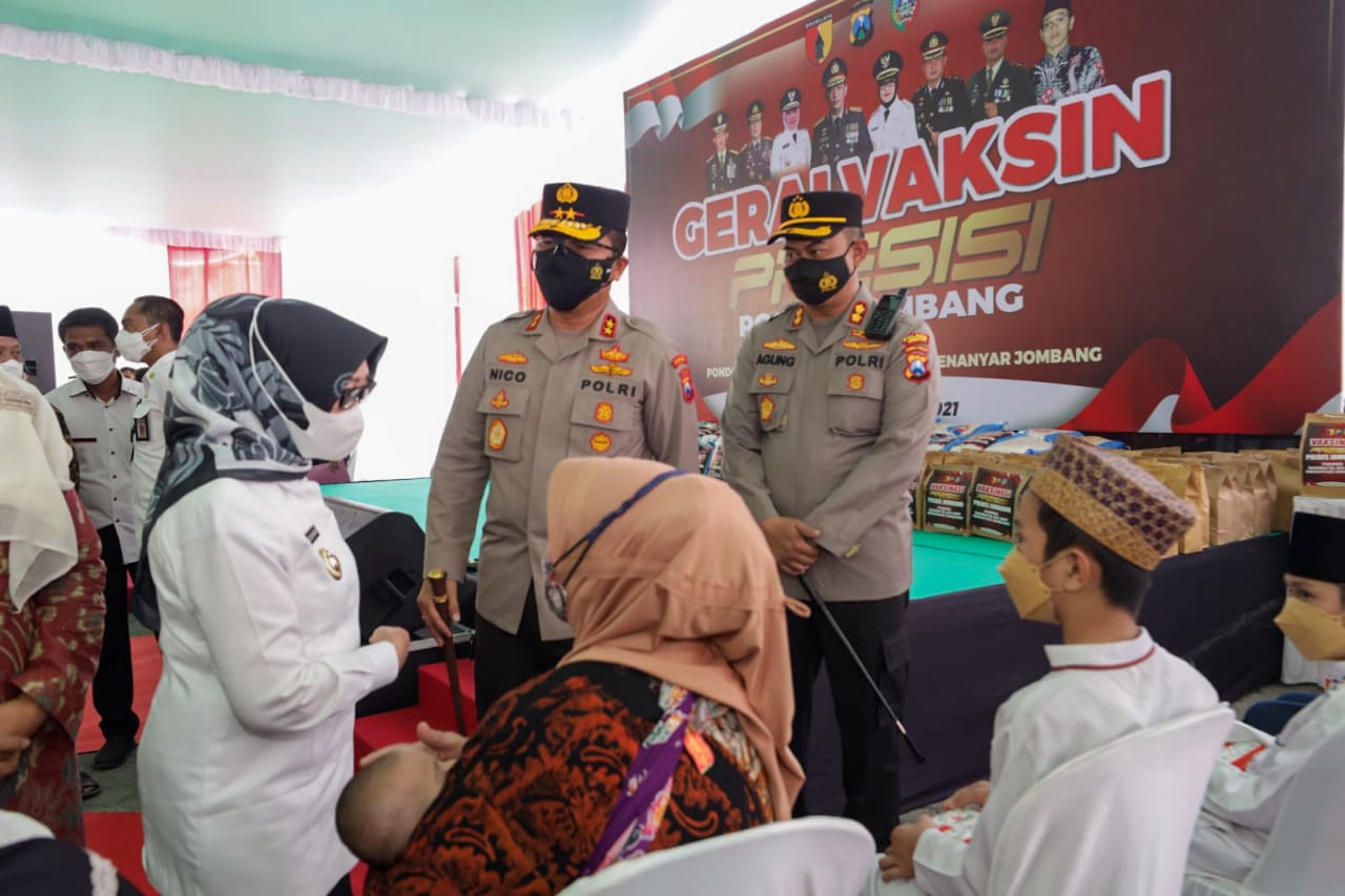 ” titip pesan kepada para santri dan masyarakay agar tak kendor dalam menerapkan protokol kesehatan,” pesan Irjen Nico Afinta didampingi Kapolres Jombang AKBP Agung Setyo Nugroho, dan Bupati Jombang Mundjidah Wahab serta Pengasuh Ponpes Mambaul Maarif Denanyar, KH Abdussalam Sohib, Rabu (6/10/2021).