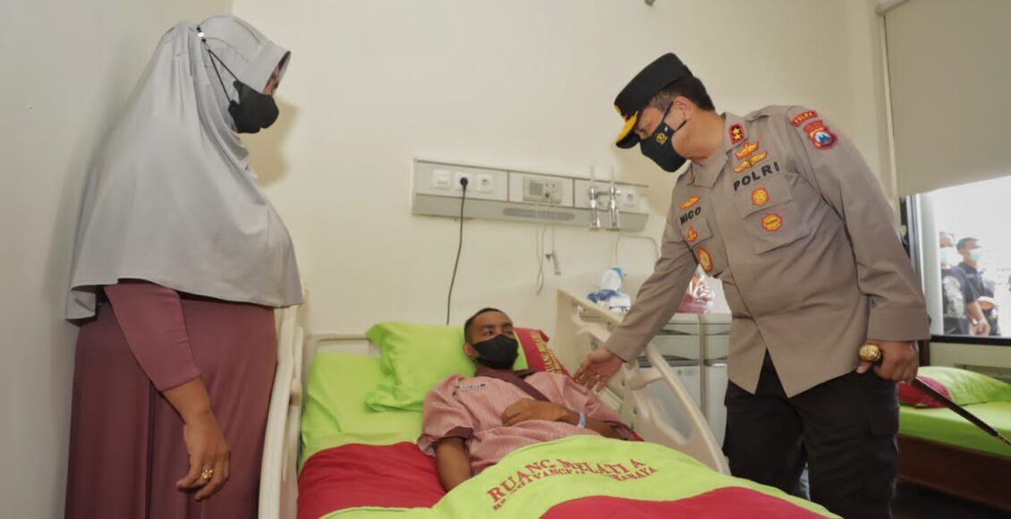 “Anggota kami ini pada saat bertugas pengamanan sepakbola terkena lemparan batu yang mengenai mata sebelah kiri. Untuk itu kami dengan jajaran polda menjenguk untuk memberikan semangat kepada anggota, memastikan mendapat pengobatan terbaik dan mendoakan semoga cepat sembuh,” kata Irjen Pol Nico Afinta, usai menjenguk anggota sabhara yang dirawat di RS Bhayangkara Polda Jatim, Rabu (25/5/2022).