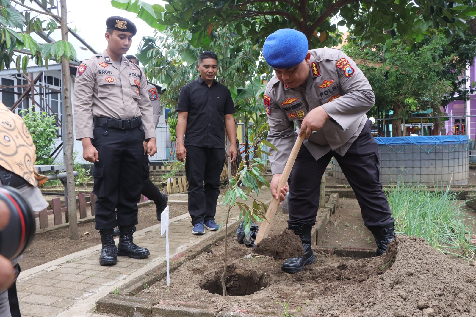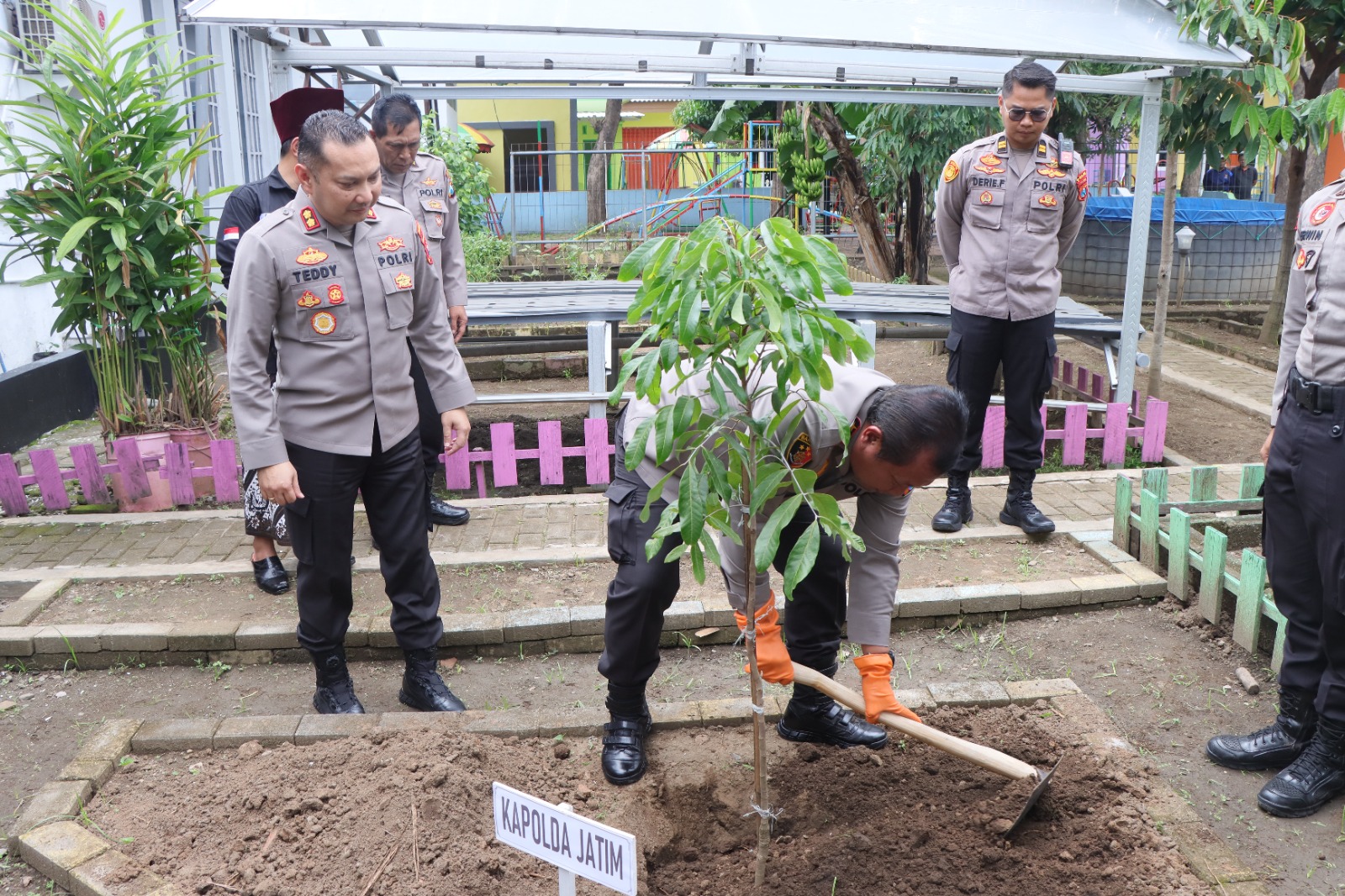 Selesai pengarahan kepada anggota Kapolda memberikan santunan kepada anak yatim di masjid Polres Kediri Kota dilanjutkan naik becak ke TK Bhyangkari Polres Kediri Kita untuk penanaman Pohon. (*)