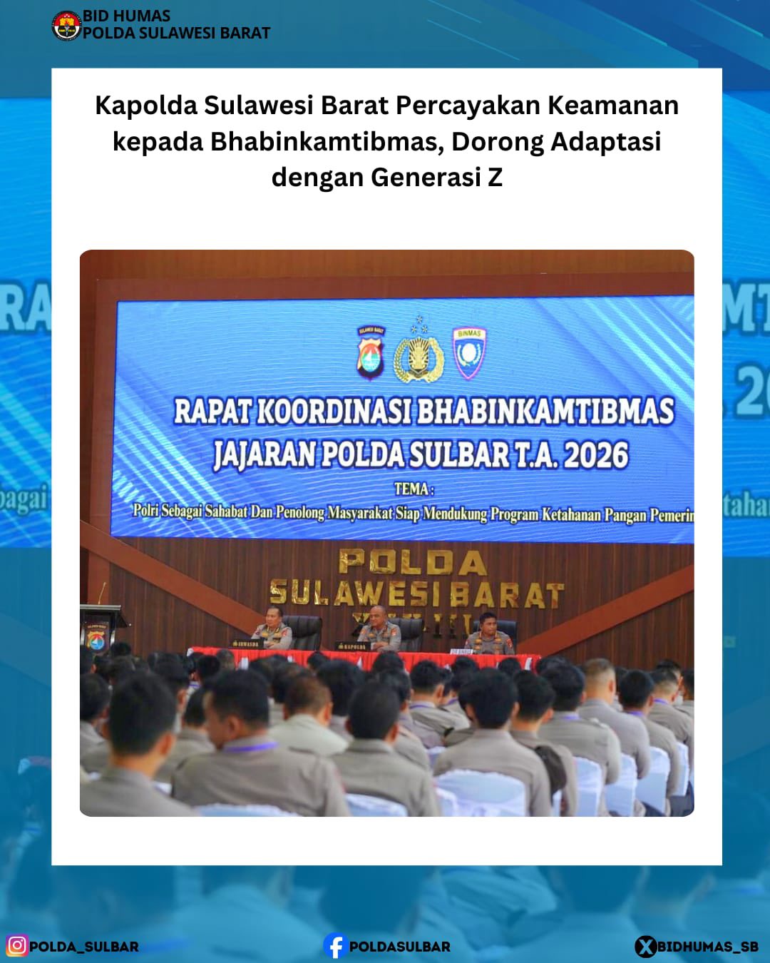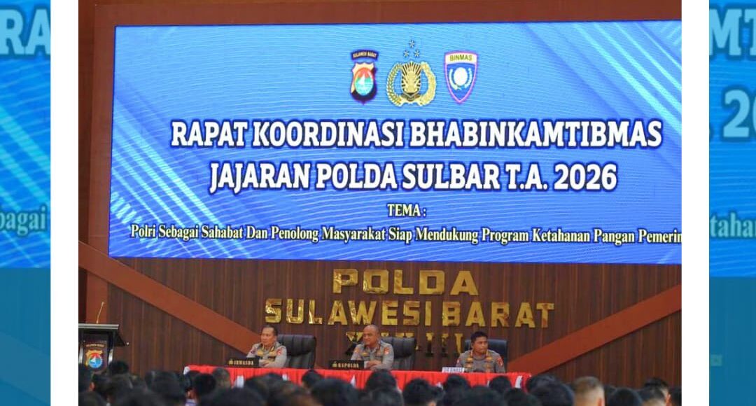 SULBAR,ikagawanews.id – Dalam rapat koordinasi (Rakor) Bhabinkamtibmas yang bertema “Polri Sebagai Sahabat dan Penolong Masyarakat Siap Mendukung Program Ketahanan Pangan Pemerintah”, Kapolda Sulbar Irjen Pol. Adi Deriyan Jayamarta, S.I.K., M.H. dengan tegas menitipkan tanggung jawab keamanan provinsi sulbar kepada para Bhabinkamtibmas.Acara yang berlangsung di Aula Marannu Mapolda ini dihadiri oleh para pejabat utama Polda Sulbar, Kapolsek dan para Bhabinkamtibmas dari seluruh jajaran serta para pemateri dari Fonder Tau Institute dan balai besar penerapan modernisasi pertanian sulbar, Kamis (19/2/26).
