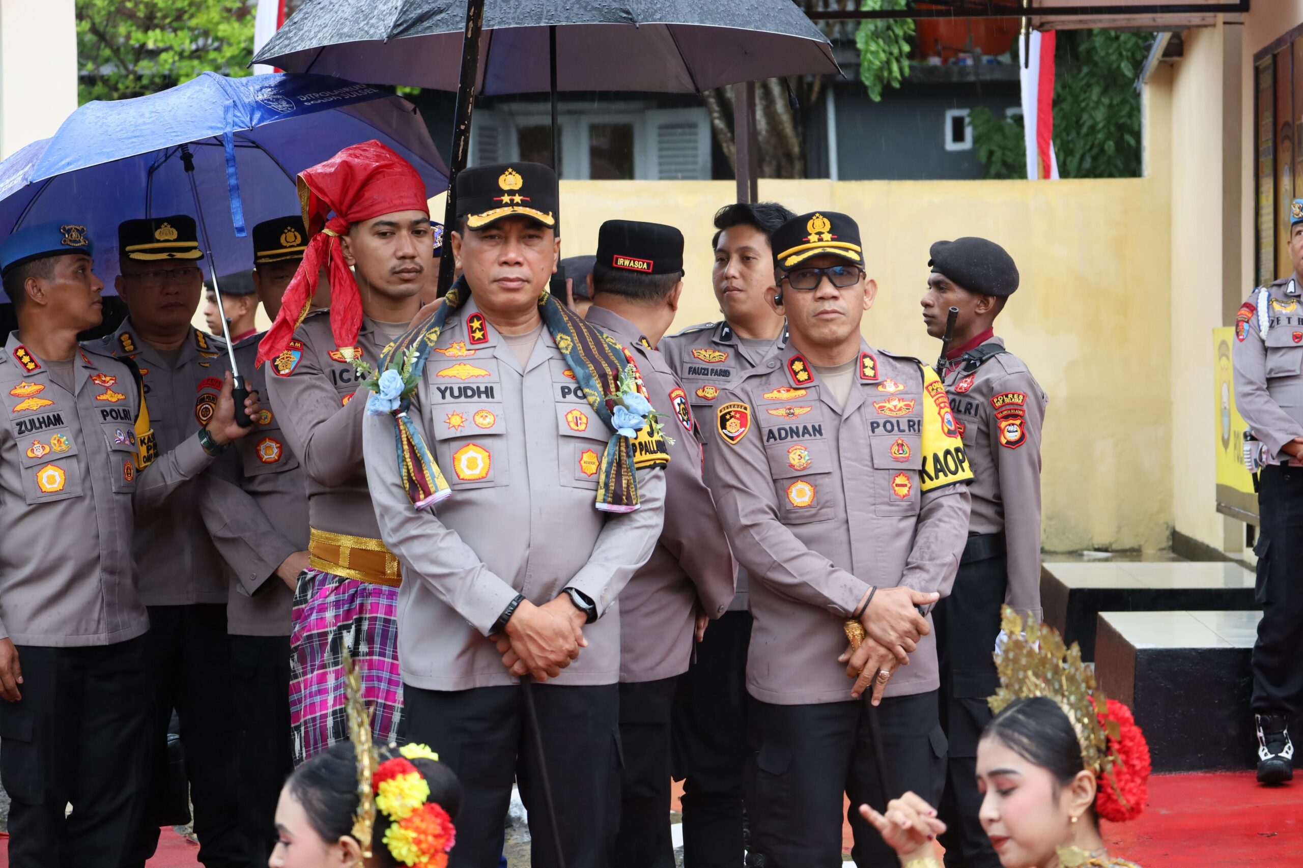 Kedatangan Kapolda Sulsel disambut dengan upacara adat, termasuk prosesi pengalungan Salempang sarung oleh Kapolres Kepulauan Selayar AKBP Adnan Pandibu, S.H., S.I.K. dan dilanjutkan Jajar Kehormatan yang dilakukan oleh personel Polres Kepulauan Selayar.