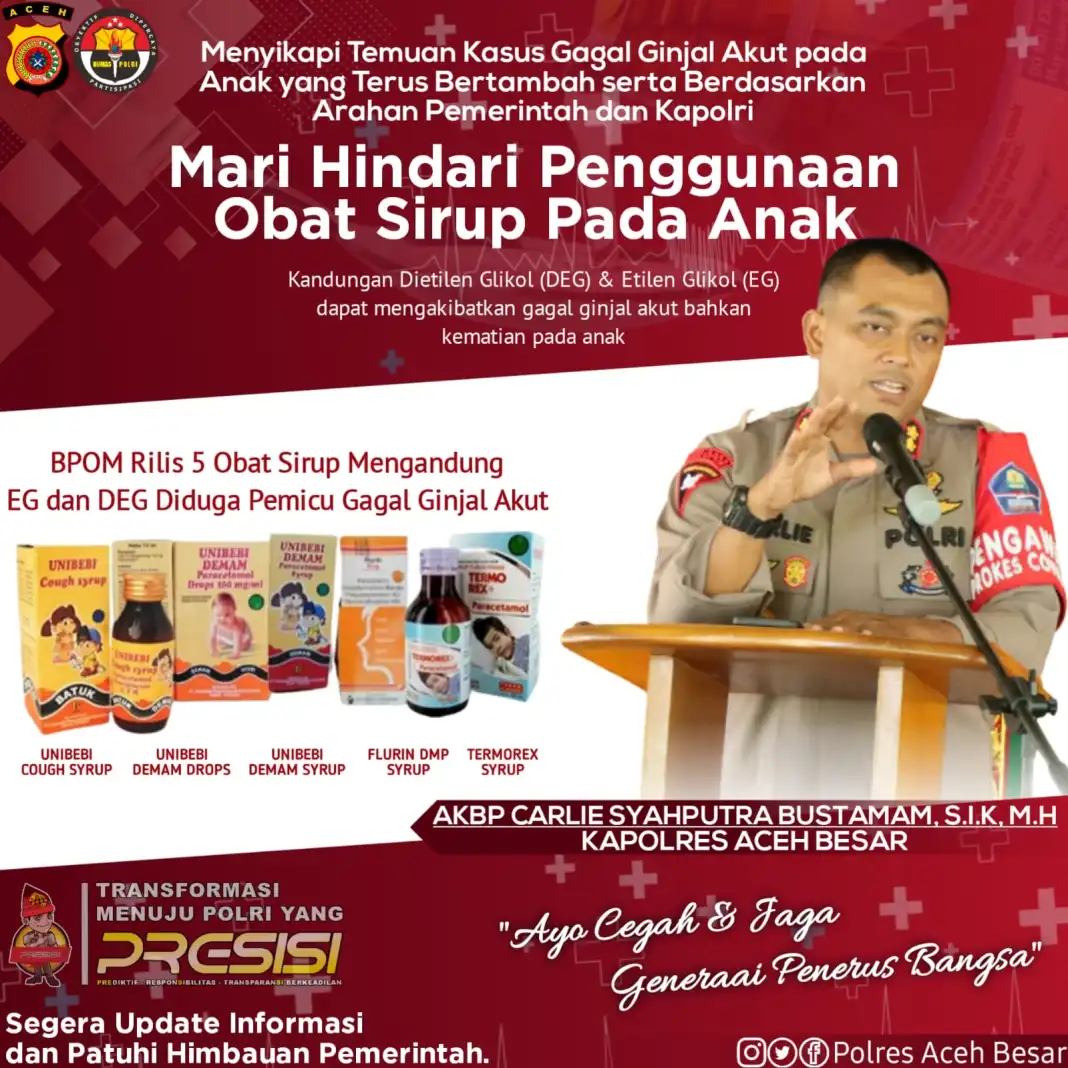Lanjut Kasie Humas Polres Aceh Besar, sesuai Surat Telegram dari Kapolri Nomor: STR/786/X/Pam.3/2022 tanggal 21 okt 2022 perihal pengoptimalan peran Bhabinkamtibmas bersinergi dengan petugas kesehatan untuk memberikan info dan edukasi kepada para orang tua terkait bahaya penggunaan obat sirup untuk anak-anak.
