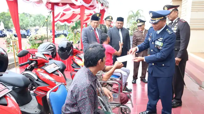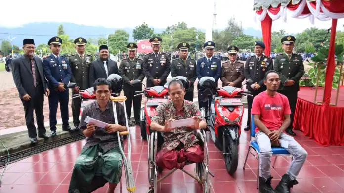 Di akhir kegiatan dilanjutkan dengan penyerahan bantuan Sosial oleh Pemerintah Daerah Kab. Aceh Besar kepada 3 penyandang disabilitas berupa becak motor secara simbolis diserahkan oleh Kapolres Aceh Besar, mewakili Danlanud SIM dan Pabung Kodim 0101/KBA kepada penerima :