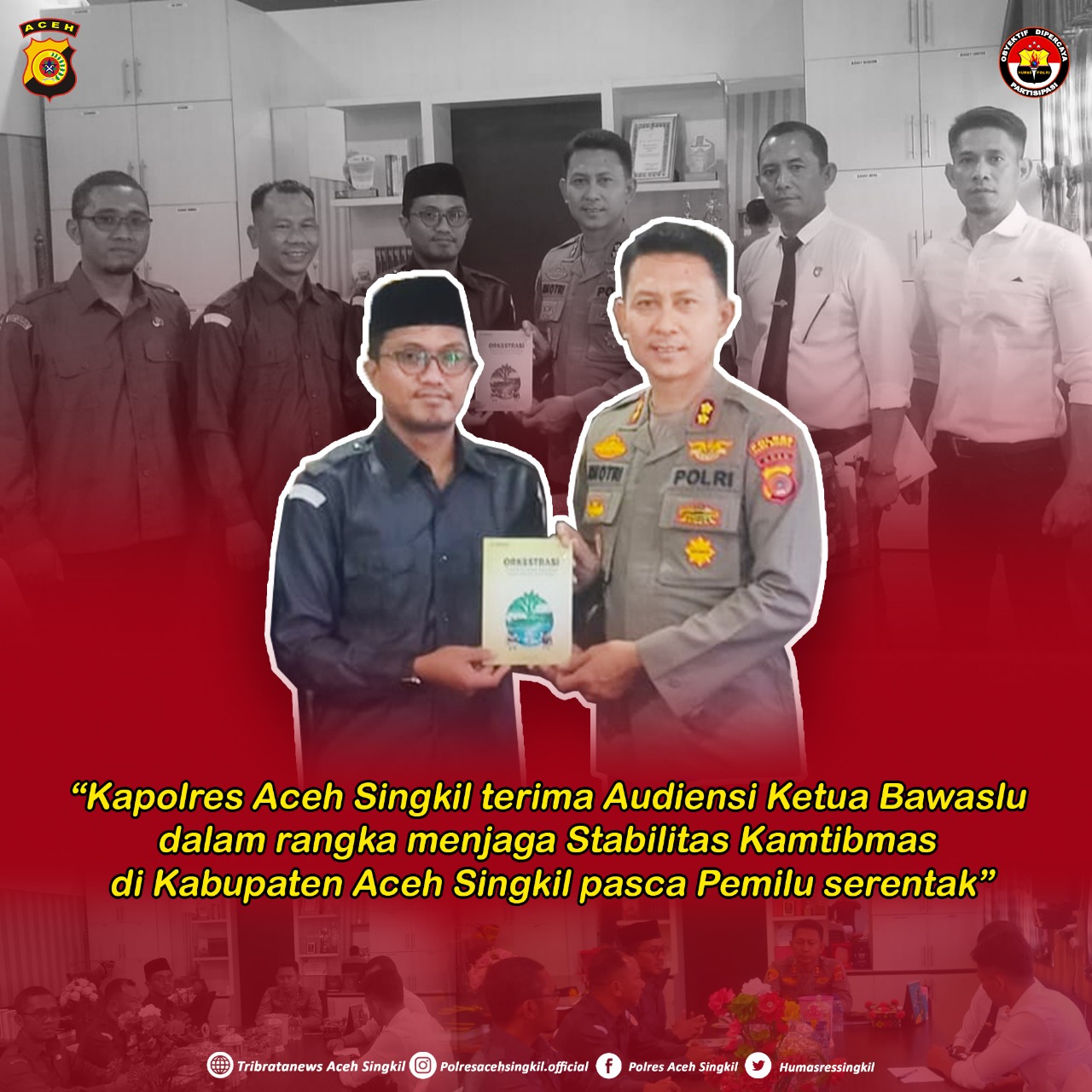 Kapolres Aceh Singkil menerima audiensi ketua bawaslu dan anggota dalam rangka menjaga stabilitas kamtibmas di kabupaten aceh singkil pasca pemilu serentak.