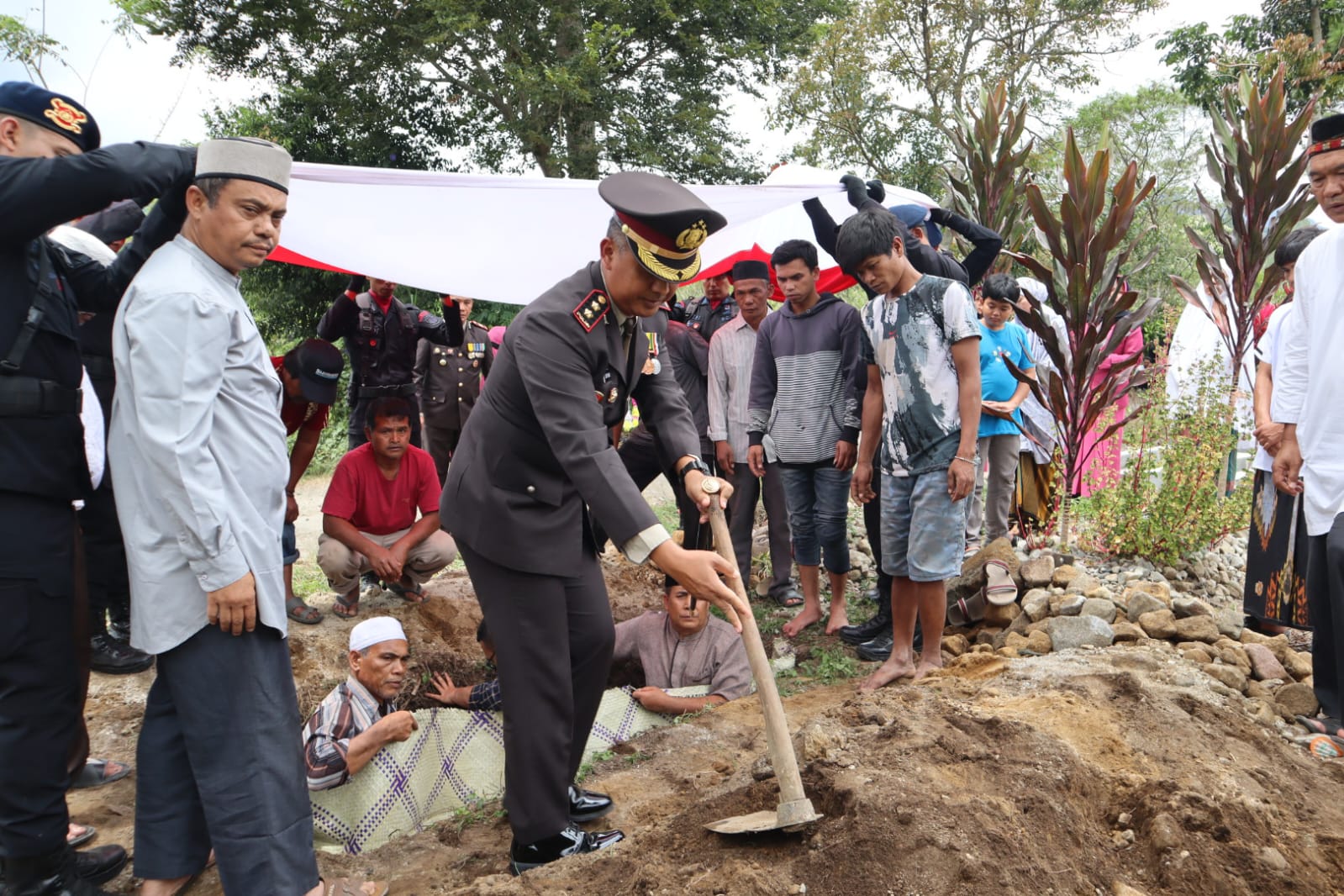 Dilanjutkan penimbunan liang lahat oleh Kapolres Aceh Tengah yang dibantu oleh personil, keluarga serta masyarakat kemudian peletakan karangan bunga.