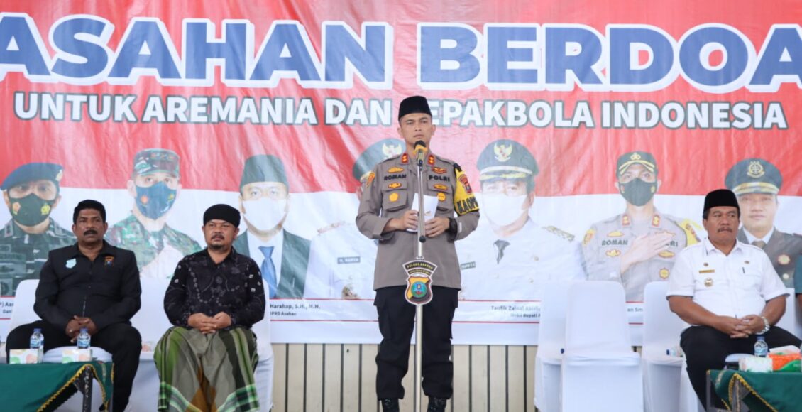 Sambutan Kapolres Asahan AKBP Roman Smaradhana Elhaj, SH,SIK,MH Doa bersama ini di gelar atas terjadinya tragedi Stadion Kanjuruhan Malang selepas pertandingan Arema vs Persebaya yang mengakibatkan jatuhnya korban jiwa. Pemerintah Kabupaten Asahan turut prihatin atas apa yang terjadi di Stadion Kanjuruhan, Malang. Semoga kejadian dan tragedi di Kanjuruhan dapat menjadi pembelajaran bagi kita semua, semoga pula tragedi seperti ini menjadikan sepak bola Indonesia lebih baik lagi, ucap Kapolres Roman.