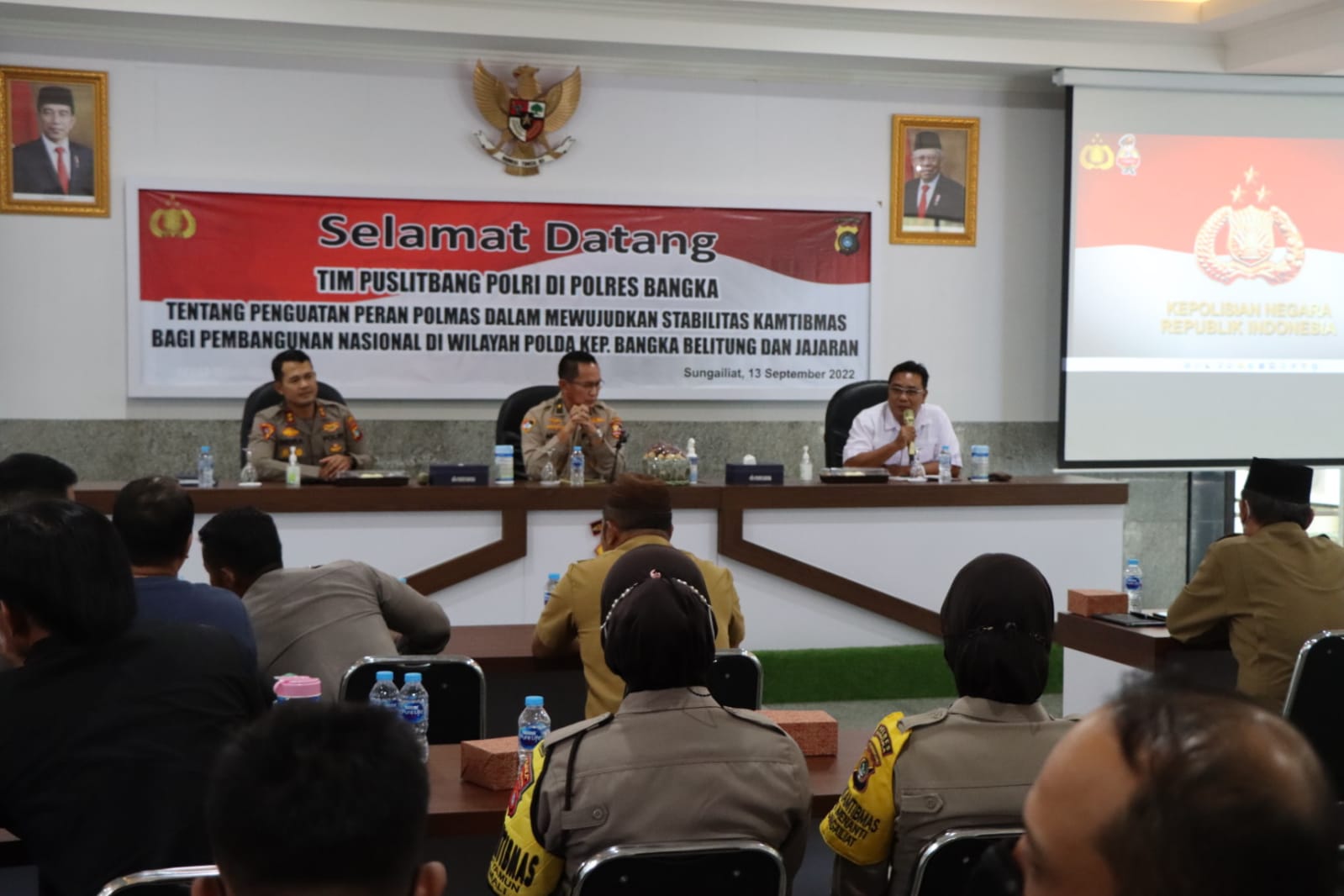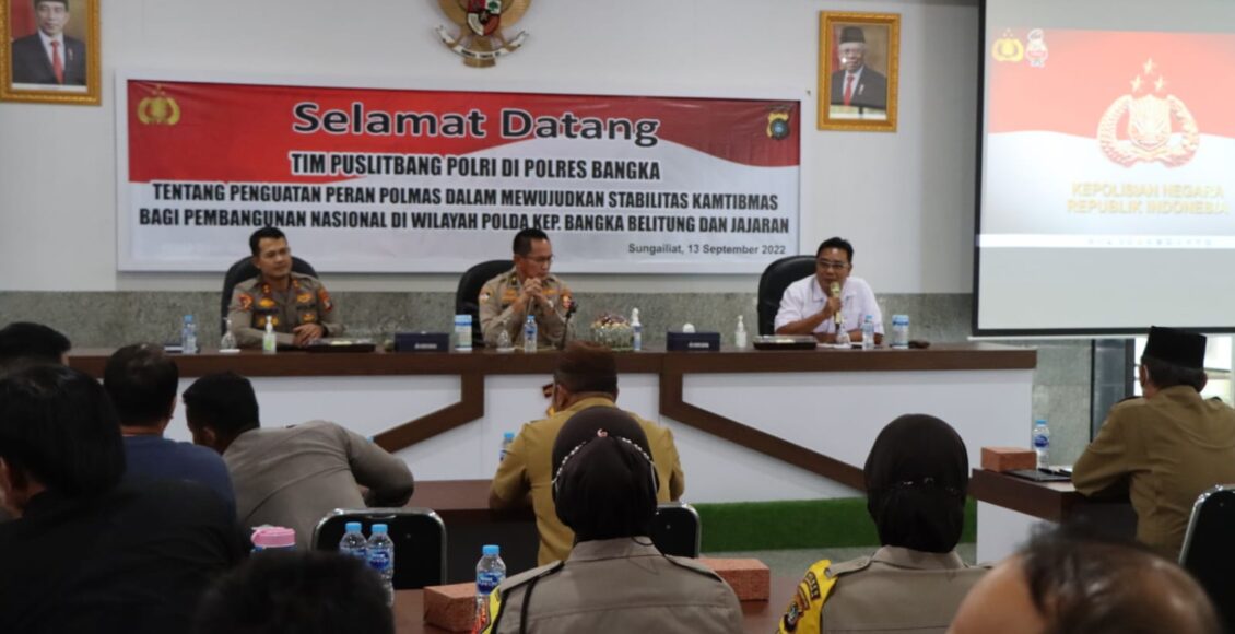 Sungailiat,ikagawanews.id – Polres Bangka terima kunjungan Tim Puslitbang Polri dalam rangka Pelaksanaan Penelitian Tentang Penguatan Peran Polmas dalam Mewujudkan Stabilitas Kamtibmas bagi Pembangunan Nasional di Aula Tribrata.Selasa (13/9/2022)