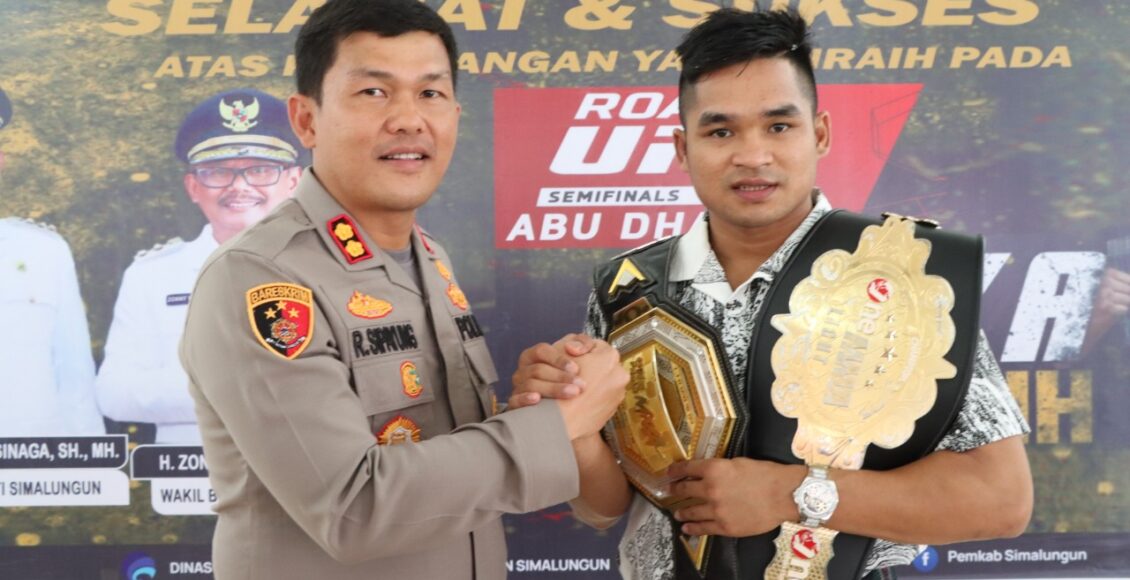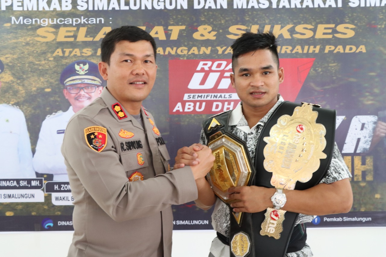 Dalam kesempatan itu, Bupati didampingi Wakil Bupati, Ketua DPRD Timbul Jaya Sibarani bersama Wakil Ketua DPRD Elias Barus, Kapolres AKBP Ronald FC Sipayung, Dandim 0207/Sml diwakili Kasdim Mayor Inf Margana, Kepala BNN AKBP Suhana Sinaga dan Kacab Bank Sumut Pamatang Raya memberikan dukungan pembinaan menuju final UFC kepada Jeka Aparido Saragih sebesar Rp.75.000.000.