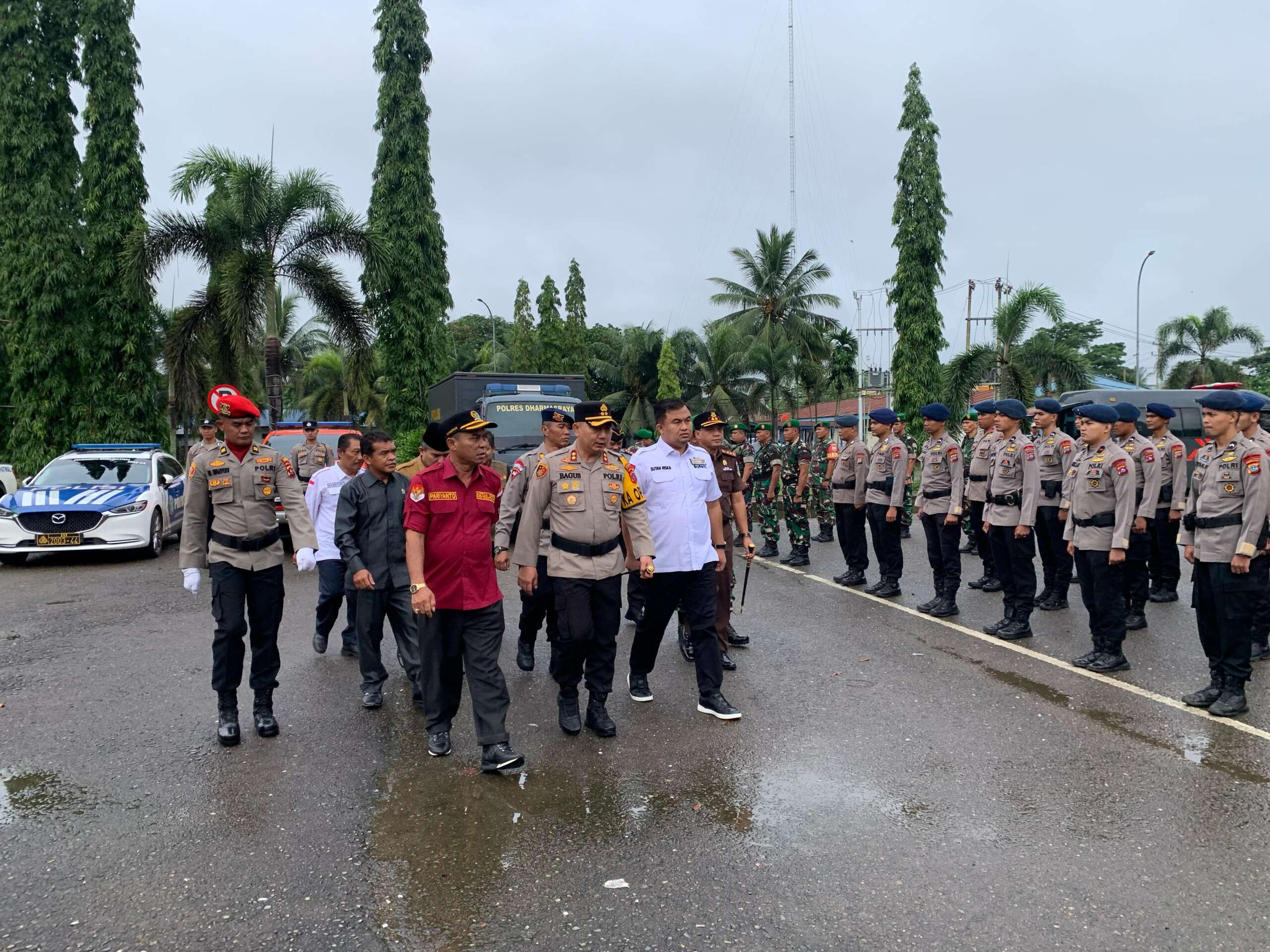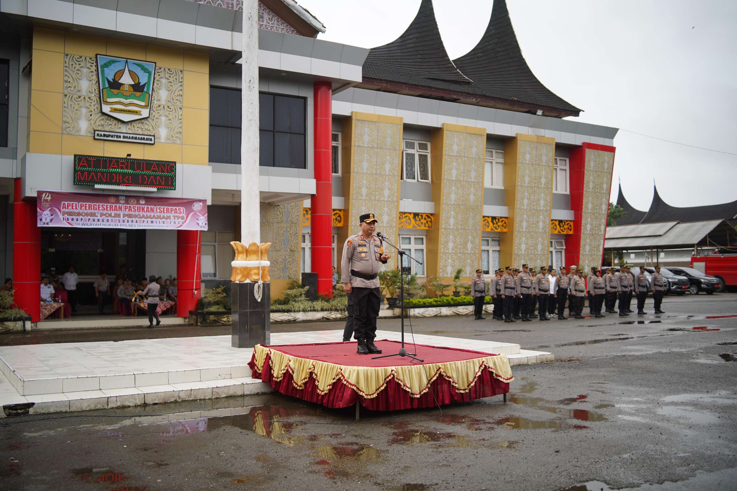 Dalam apel serpas ini, Kapolres Dharmasraya secara simbolis memasangkan Ban Lengan kepada perwakilan personil Pam TPS. Setelah itu, bersama Bupati, Ketua DPRD, Kajari, Ketua KPU, dan Ketua Bawaslu, Kapolres melakukan pemeriksaan pasukan untuk memastikan kesiapan pengamanan TPS.