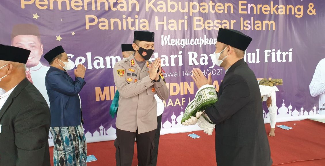 Enrekang,IKAGAWANEWS.ID – Kepala Kepolisian Resort (Kapolres) Enrekang AKBP Dr. Andi Sinjaya, SH., S.I.K, M.H. bersama Forkopimda Kab Enrekang mengikuti Sholat Idul Fitri 1442 H 2021 M. di Lapangan Sepak Bola Abu Bakar Lambogo Batili Kel. Galonta Kec. Enrekang Kab. Enrekang, Kamis 13 Mei 2021 pukul 07.15 wita.