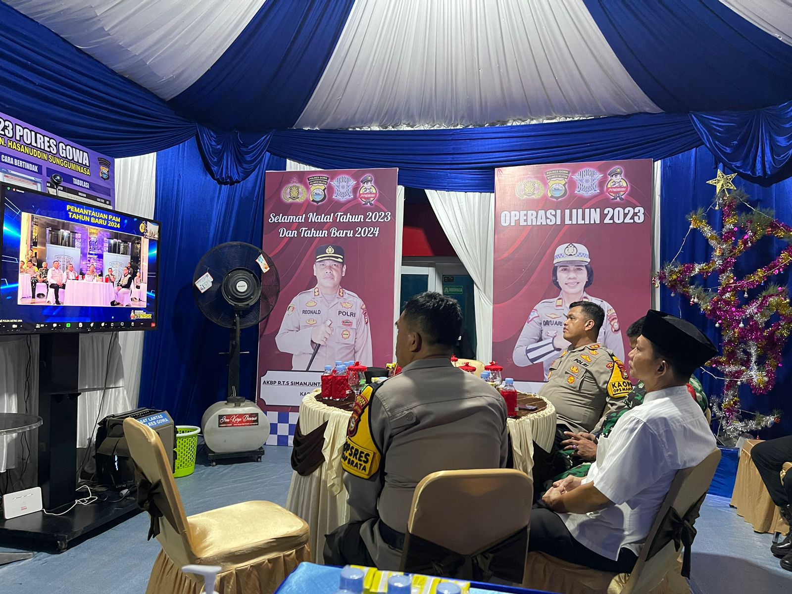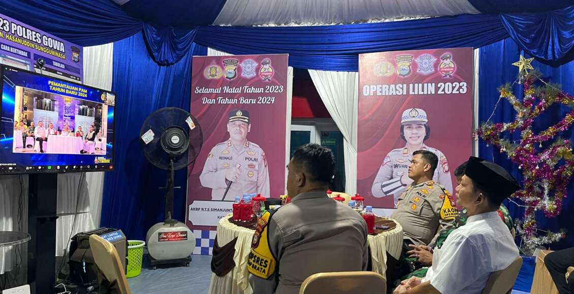 Bertempat di Pos Pengamanan Operasi Lilin-2023 Polres Gowa Batas Kota Gowa-Makassar Jalan Sultan Hasanuddin Kecamatan Somba Opu Kabupaten Gowa, Kapolres Gowa AKBP R.T.S Simanjuntak, S.H., S.I.K., M.M., M.I.K didampingi Wakapolres Gowa KOMPOL Soma Miharja, S,Sos, MM, bersama PJU Polres Gowa dihadiri Dandim 1409 Gowa Letkol Inf. Muhammad Isnaeni Natsir dan Bupati Gowa (diwakili) mengikuti Kegiatan Kapolri melalui Zoom meeting, Minggu (31/12/2023) Malam.