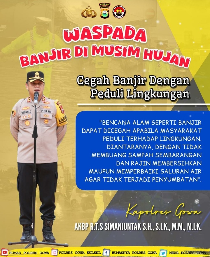 Selain itu, Polres Gowa melalui Bhabinkamtibmas di setiap desa juga aktif memberikan penyuluhan kepada warga tentang pentingnya menjaga kebersihan lingkungan untuk mengurangi risiko banjir.