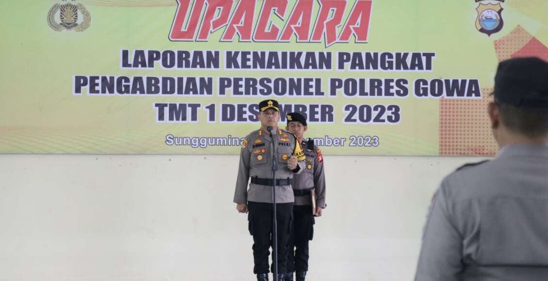GOWA,ikagawanews.id – Kapolres Gowa, AKBP R.T.S Simanjuntak, S.H., S.I.K., M.M., M.I.K., memimpin upacara Korps Raport kenaikan pangkat perwira pengabdian, TMT 1 Desember 2023, bertempat di Aula Rewako Polres Gowa, pada Jumat sore (01/12/2023).