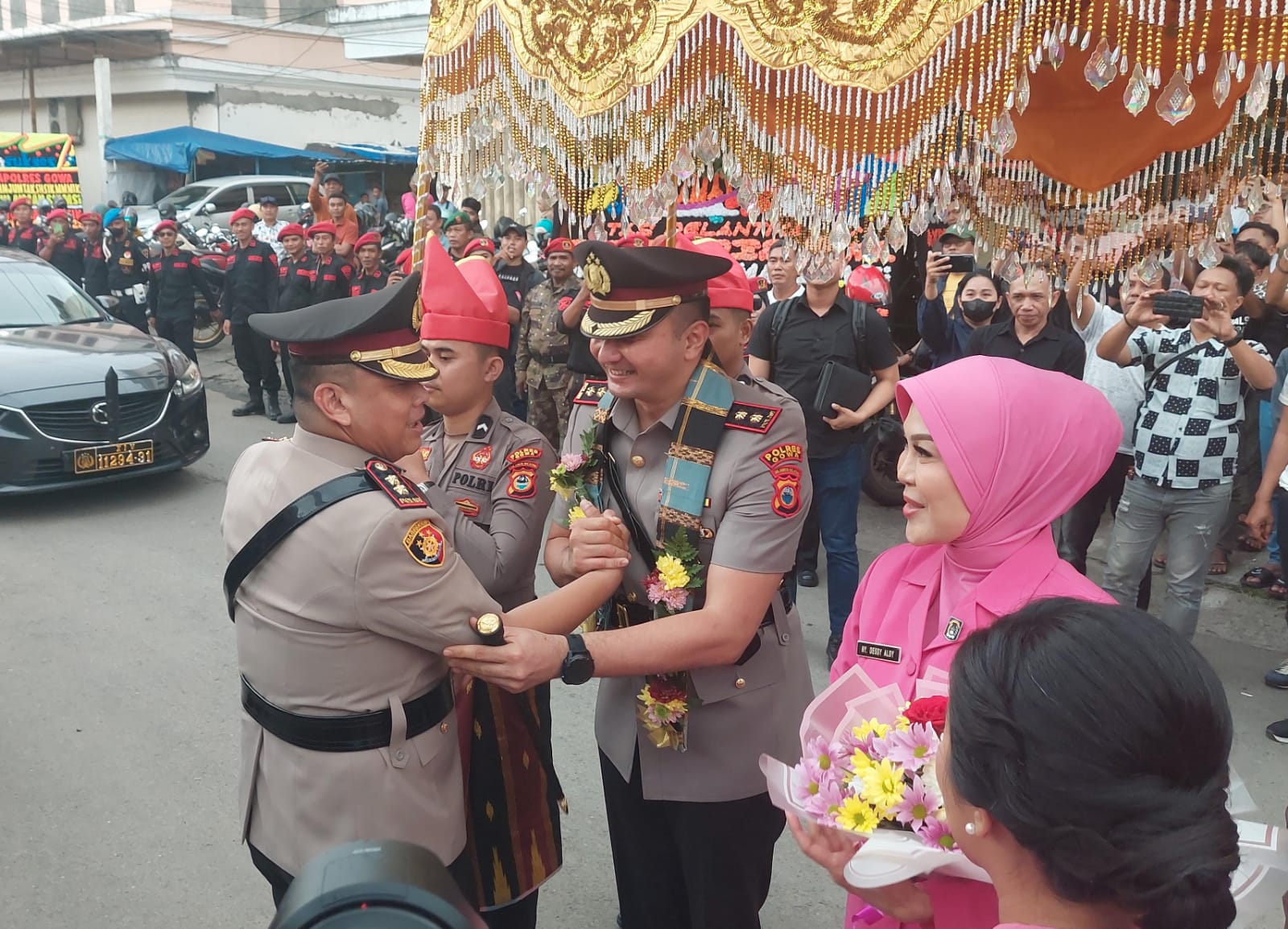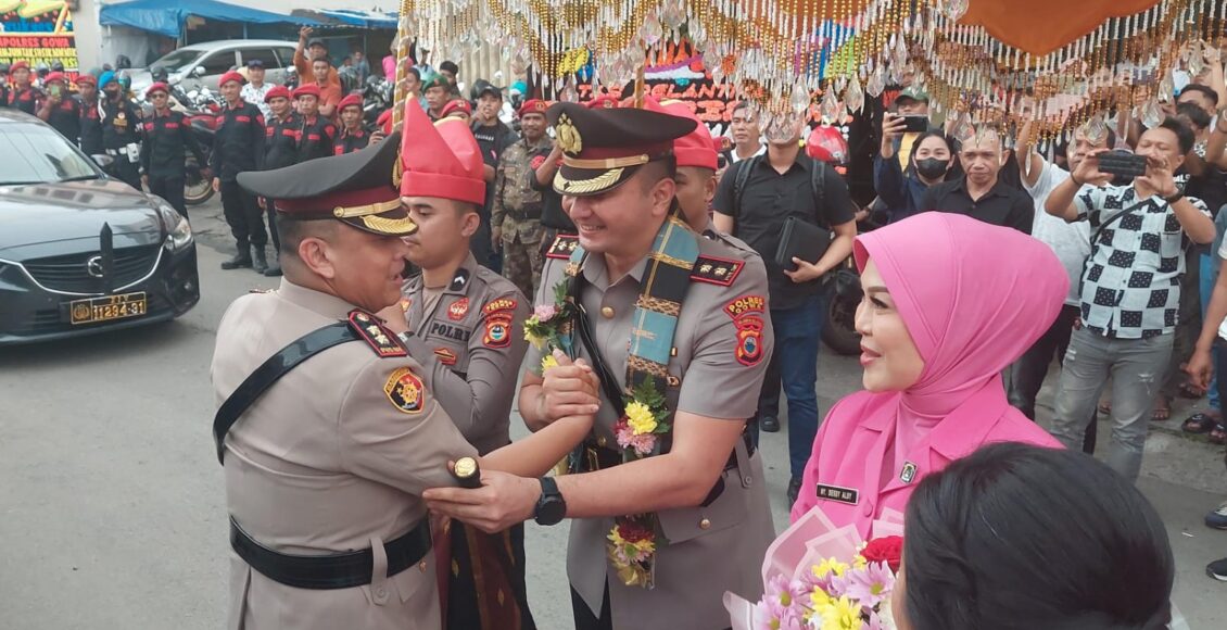 Kapolres Gowa yang baru disambut hangat oleh Kapolres sebelumnya, AKBP R.T.S. Simanjuntak, S.H., S.I.K., M.M., M.I.K., didampingi Ibu Ketua Bhayangkari Cabang Gowa sebelumnya, Ny. Lidya Reonald.