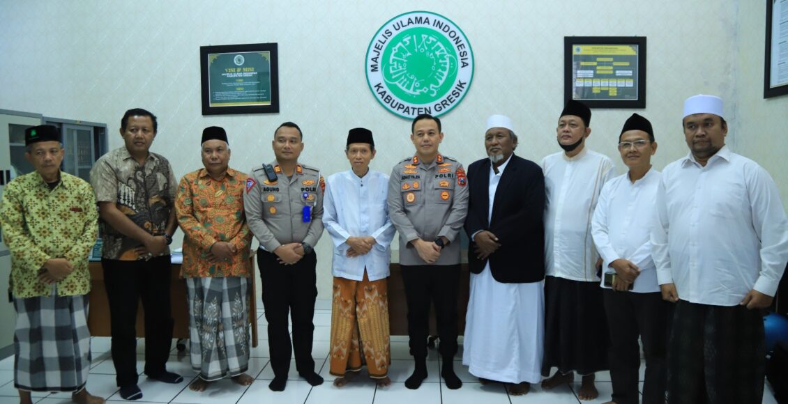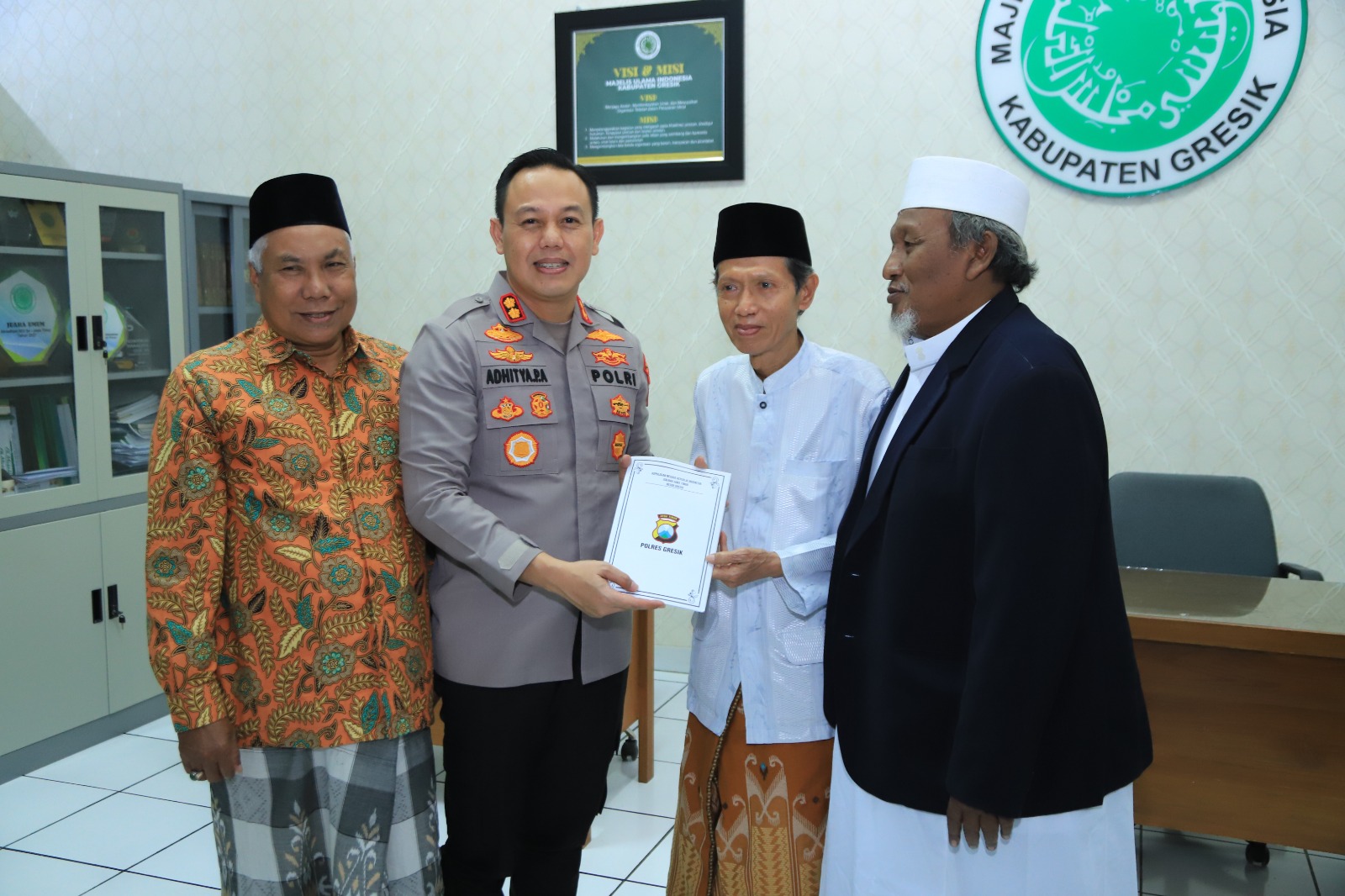 Kapolres Gresik didampingi Kasatlantas Polres Gresik AKP Agung Fitriansyah, Kasat Intelkam Polres Gresik Iptu Anang Fathoni ditemui langsung Ketua MUI Gresik Drs. KH. M. Mansoer Shodiq M.Ag bersama KH. Ainur Rafiq Thoyyib S.PdI Wakil Ketua MUI Kab. Gresik, Drs H. Abd. Munif M.Ag Sekertaris MUI Kab. Gresik, Drs. Nur Fakih Wakil Sekertaris MUI Kab. Gresik, Dr. Abdul Chalik M.Ag Ketua Bidang Dakwah MUI Kab. Gresik, H. Muslih Hasyim S.Ag., M.BA Ketua Bidang Pemberdayaan Ekonomi MUI Kab. Gresik, Agmad Mishabul Abidin M.Pd.I
