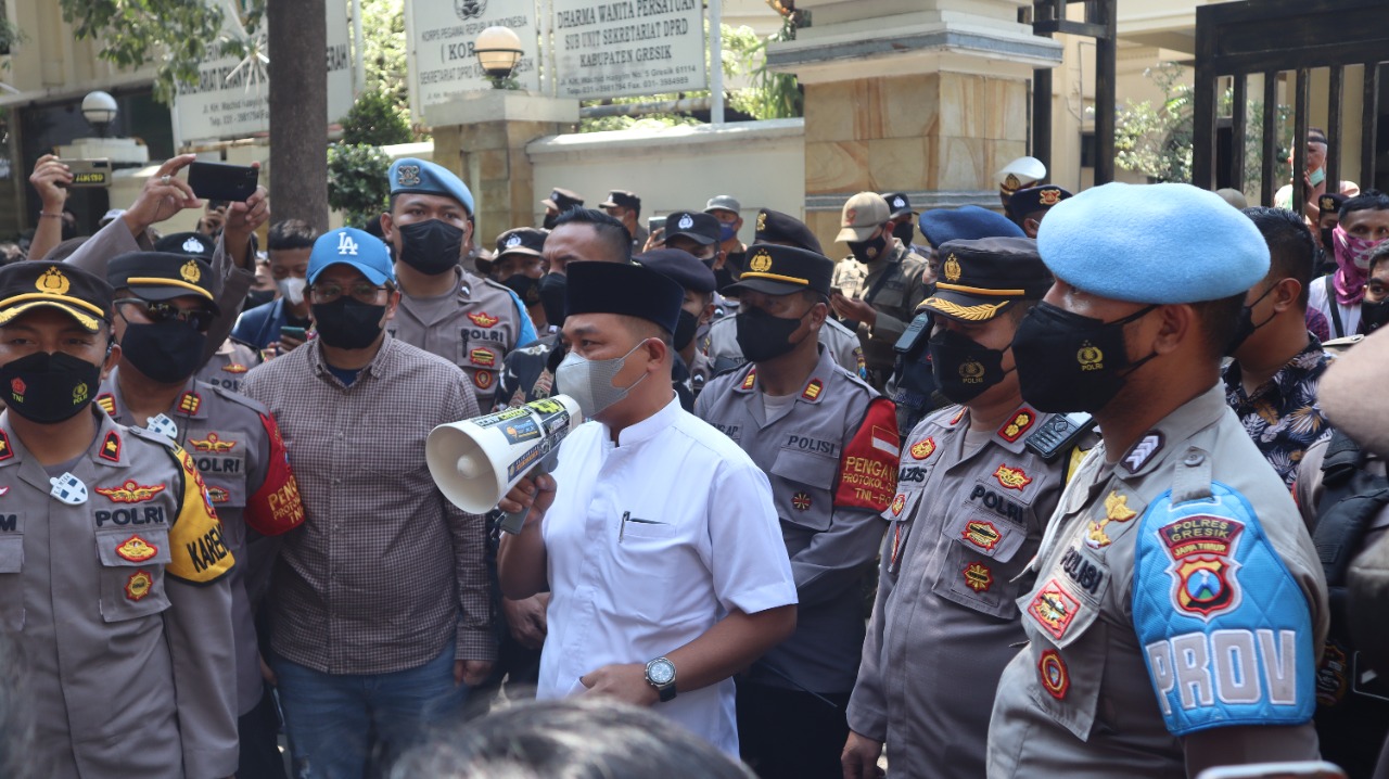 Ratusan massa aksi menyampaikan aspirasi di depan gedung DPRD Gresik. Aksi berjalan kondusif, tidak ada dorong-dorongan dan lain sebagainya. Sebanyak enam tuntutan mahasiswa disampaikan dengan baik.